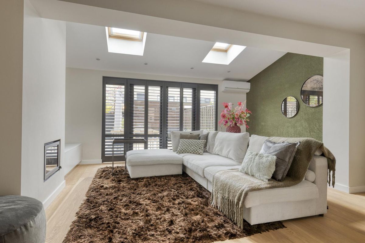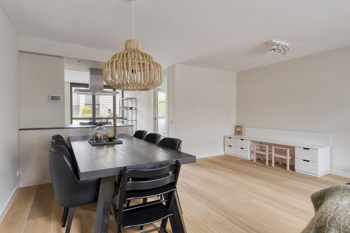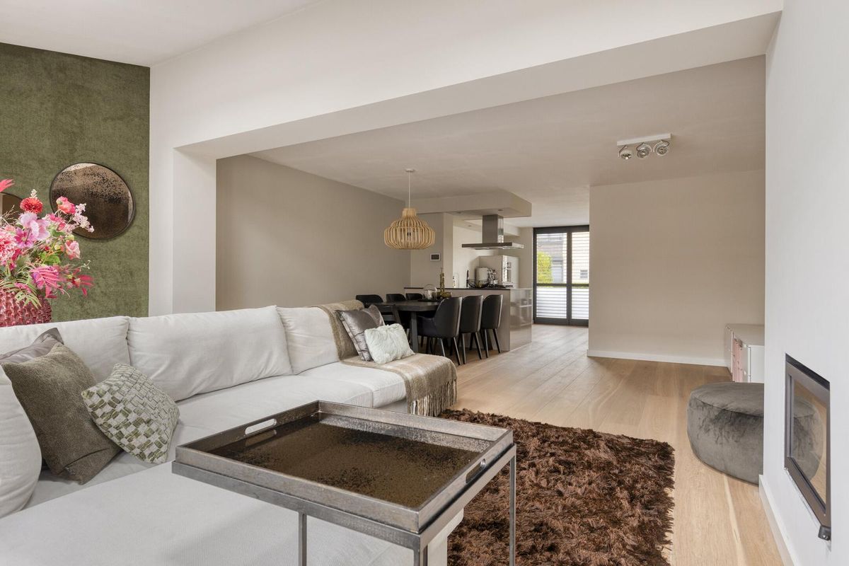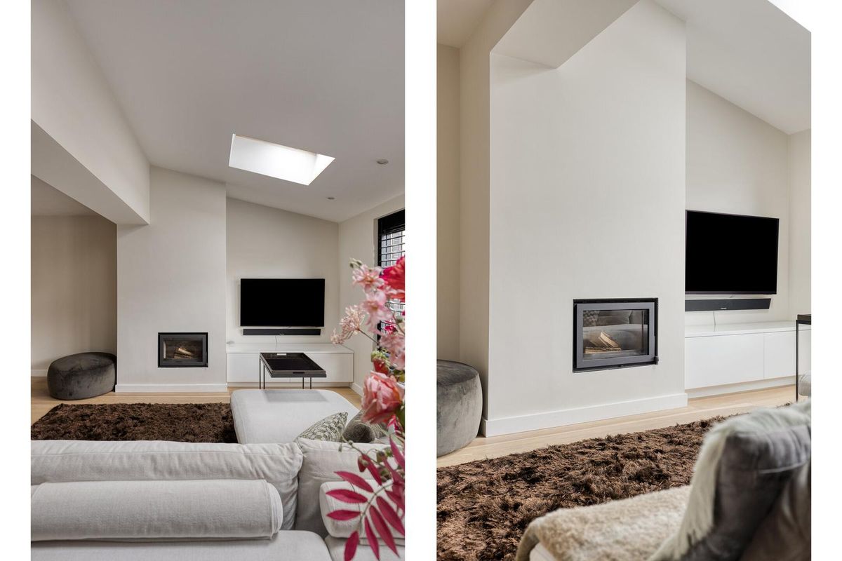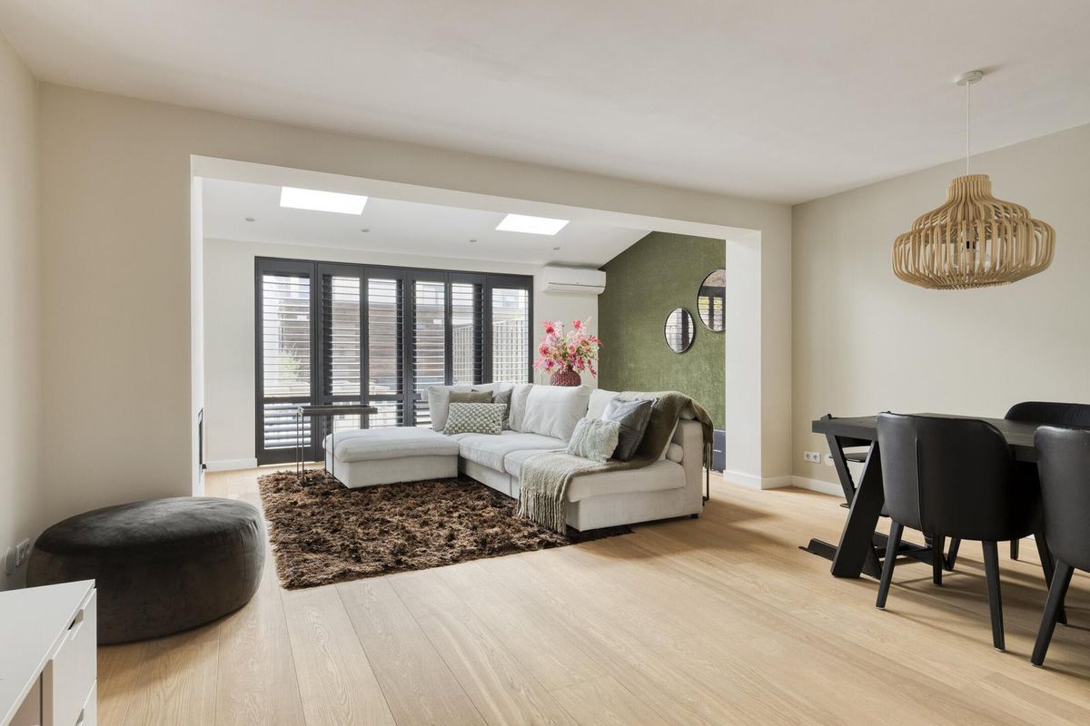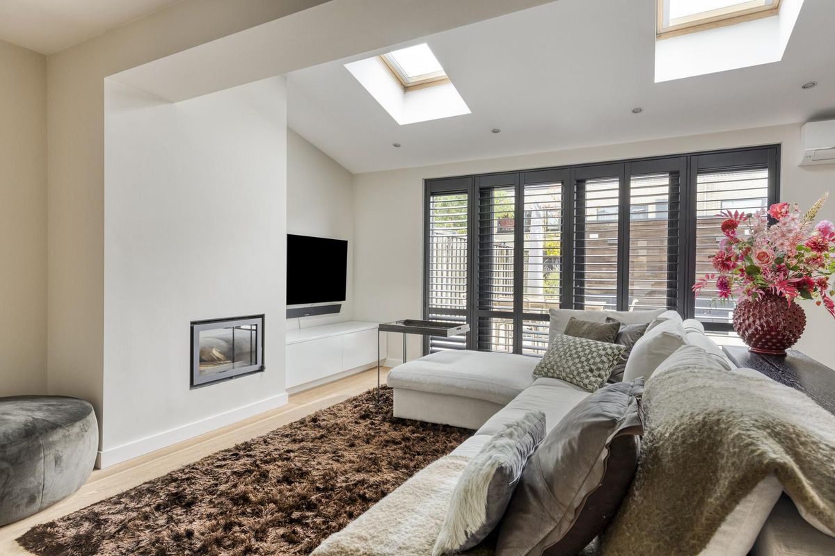 De woonkamer is echt het hart van de woning. Dankzij de grote raampartijen aan de achterzijde, twee extra dakramen én de ligging aan de tuin, baadt de ruimte in natuurlijk licht. De moderne zwarte shutters geven de woonkamer een luxe uitstraling en bieden tegelijk de mogelijkheid om het licht te temperen als je zin hebt in een knusse avond. De gezellige haard maakt het helemaal af, ideaal voor een ontspannen avond op de bank. De woonkamer vloeit moeiteloos over in de eetkamer, waar je met gemak een grote eettafel kwijt kunt. De perfecte plek voor lange diners met vrienden of een gezellige brunch met het gezin. De open keuken aan de voorzijde van de woning is strak en modern ingericht. Denk aan witte kastjes, een mooi werkblad en ingebouwde spotverlichting in het plafond. Hier vind je alles wat je nodig hebt: een combi-oven, koelkast, vriezer, vaatwasser (recent nieuwe geplaatst extra ruime en luxe) én een Quooker voor direct kokend water. Ook in de keuken zorgen de zwarte shutters voor een mooie mix van modern en sfeervol.