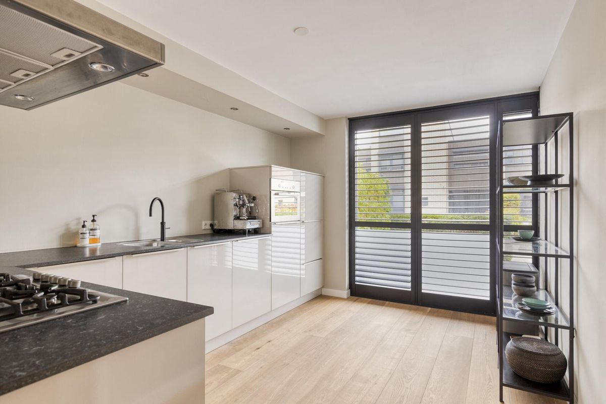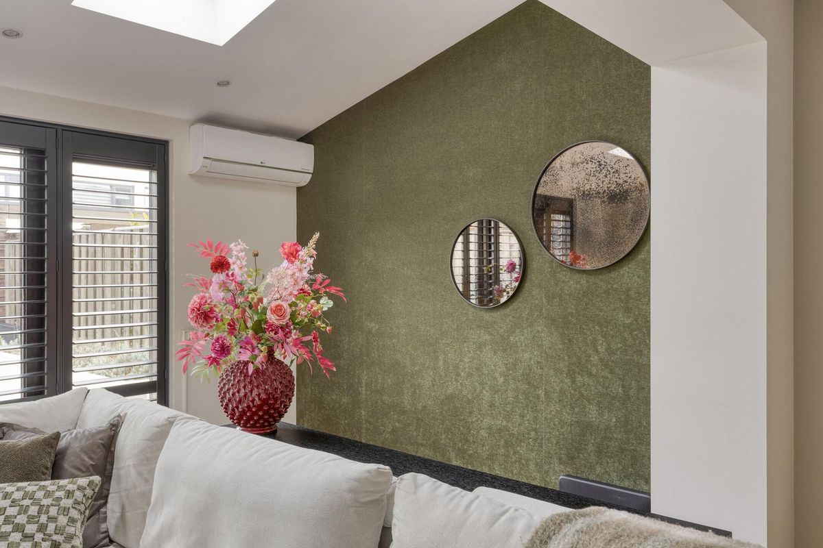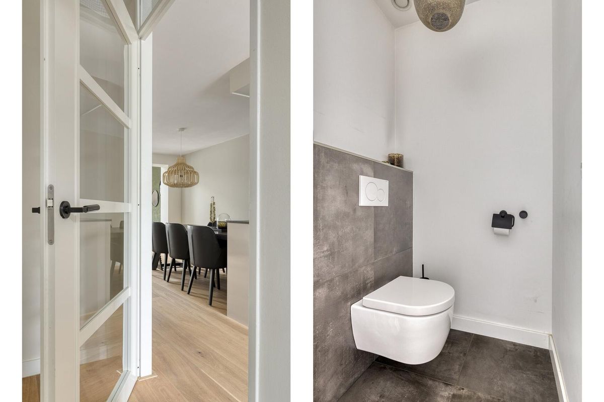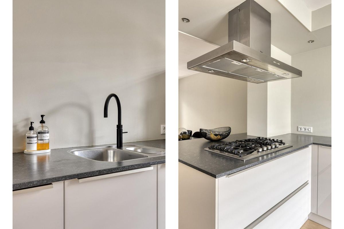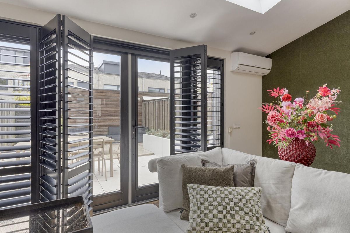 De woonkamer is echt het hart van de woning. Dankzij de grote raampartijen aan de achterzijde, twee extra dakramen én de ligging aan de tuin, baadt de ruimte in natuurlijk licht. De moderne zwarte shutters geven de woonkamer een luxe uitstraling en bieden tegelijk de mogelijkheid om het licht te temperen als je zin hebt in een knusse avond. De gezellige haard maakt het helemaal af, ideaal voor een ontspannen avond op de bank. De woonkamer vloeit moeiteloos over in de eetkamer, waar je met gemak een grote eettafel kwijt kunt. De perfecte plek voor lange diners met vrienden of een gezellige brunch met het gezin. De open keuken aan de voorzijde van de woning is strak en modern ingericht. Denk aan witte kastjes, een mooi werkblad en ingebouwde spotverlichting in het plafond. Hier vind je alles wat je nodig hebt: een combi-oven, koelkast, vriezer, vaatwasser (recent nieuwe geplaatst extra ruime en luxe) én een Quooker voor direct kokend water. Ook in de keuken zorgen de zwarte shutters voor een mooie mix van modern en sfeervol.