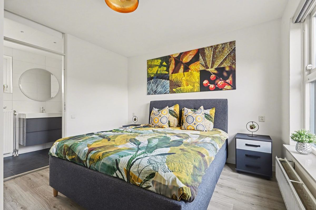 Vanuit de keuken heeft u toegang tot de garage en vanuit de woonkamer bereikt u de ruime slaapkamer (346 x 338) met en-suite badkamer (346 x 131), voorzien van inloopdouche, tweede toilet en badkamermeubel met wastafel.
