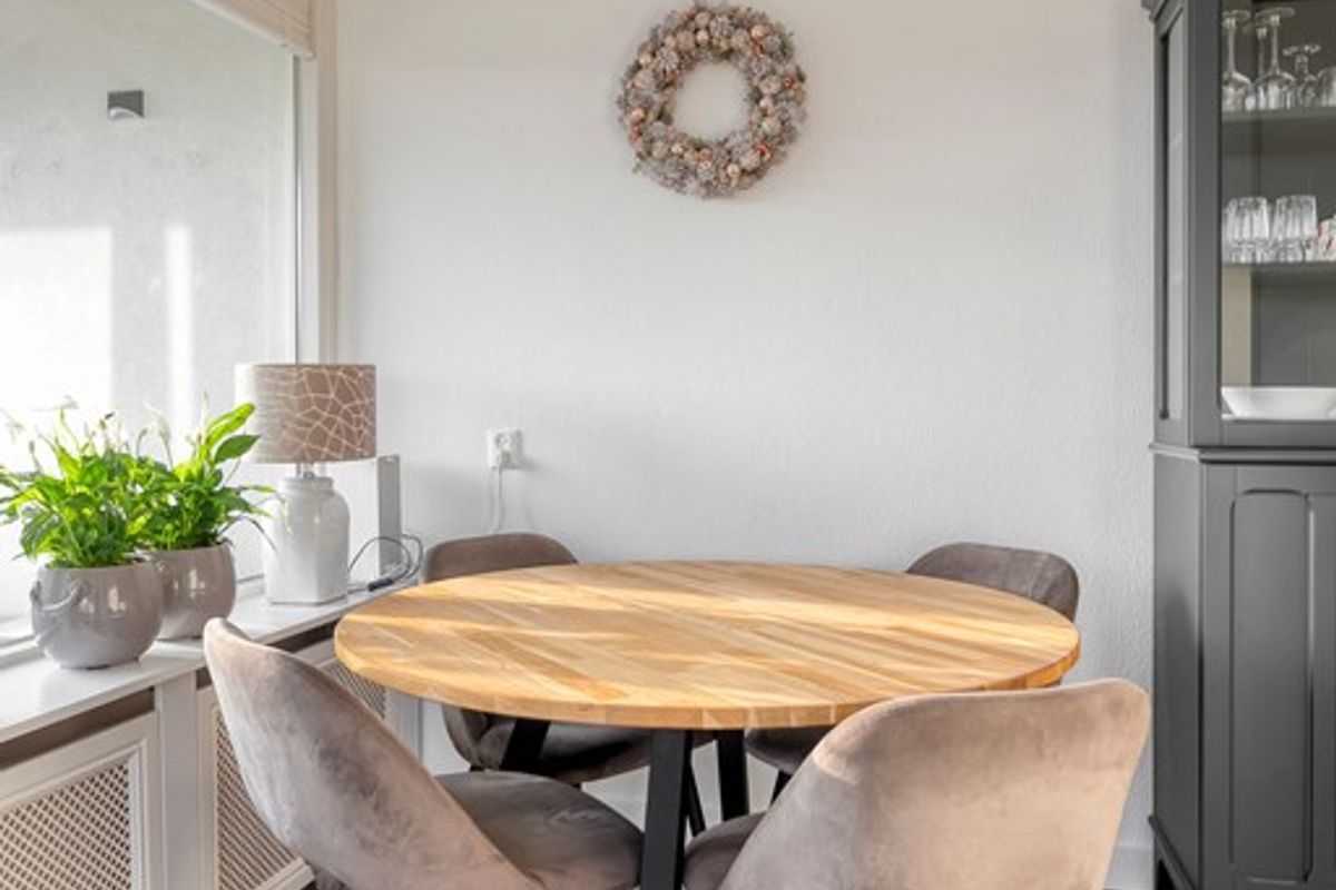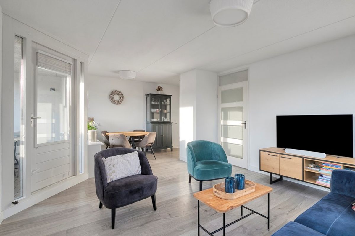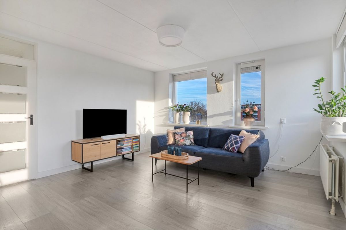 De woonkamer vormt het hart van het appartement. De grote raampartijen zorgen voor een overvloed aan licht. Door de open indeling zijn er volop mogelijkheden om een comfortabele zithoek en een gezellige eethoek te creëren. Vanuit de woonkamer heeft u direct toegang tot het balkon, wat een fijne plek biedt om te ontspannen of gasten te ontvangen. Het geheel voelt ruim en uitnodigend aan.