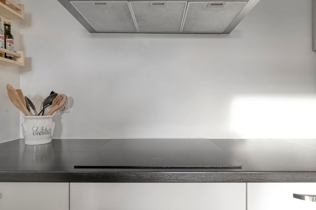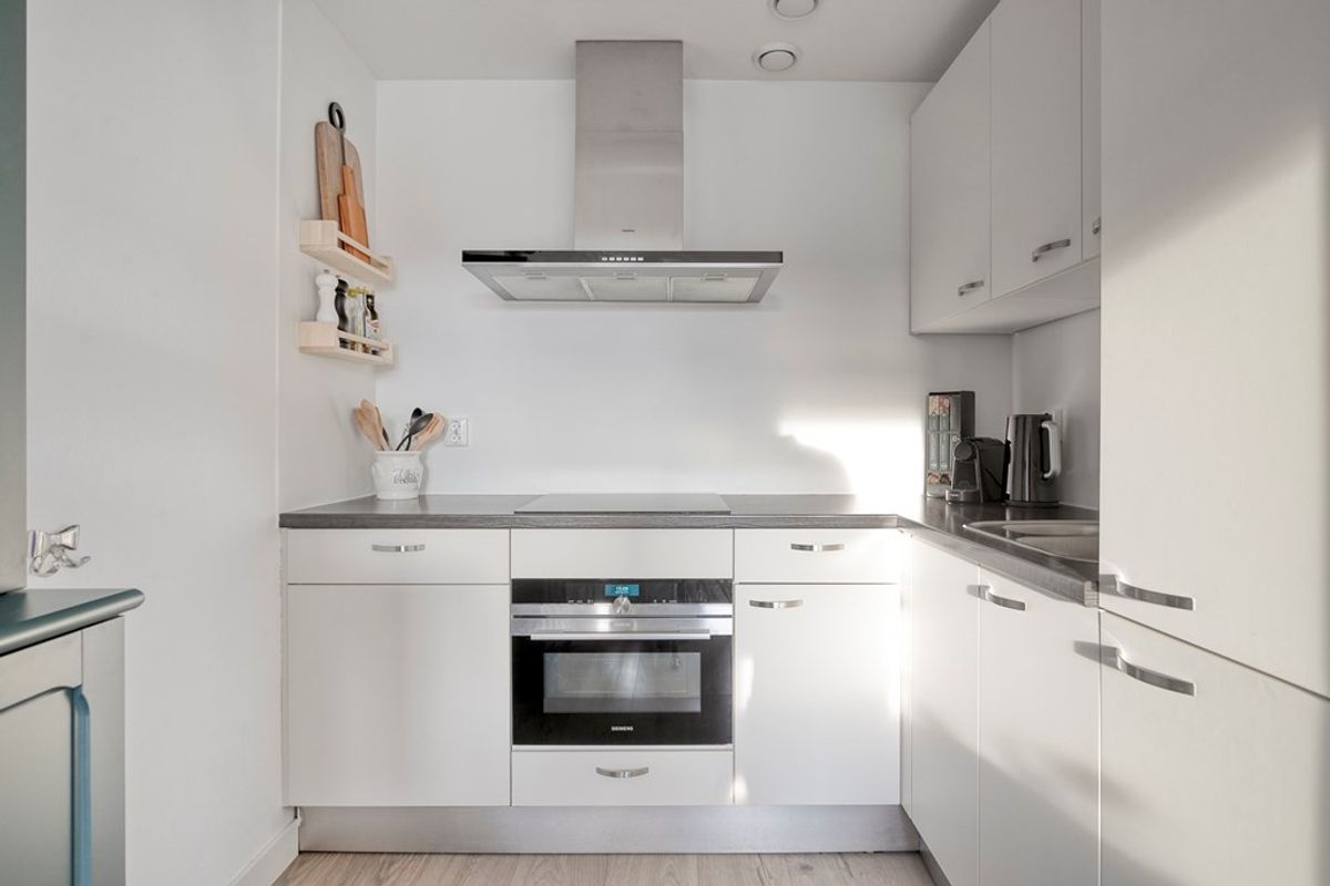De open keuken grenst naadloos aan de woonkamer en is uitgevoerd in een praktische L-vormige indeling. De keuken is voorzien van alle moderne gemakken, waaronder een inductiekookplaat met afzuigkap, koelkast, diepvriezer, vaatwasser, ovencombinatie en spoelbak. De ruime kastjes bieden voldoende opbergruimte voor al uw keukengerei en voorraad, terwijl de verzorgde uitstraling zorgt voor een frisse en eigentijdse sfeer.