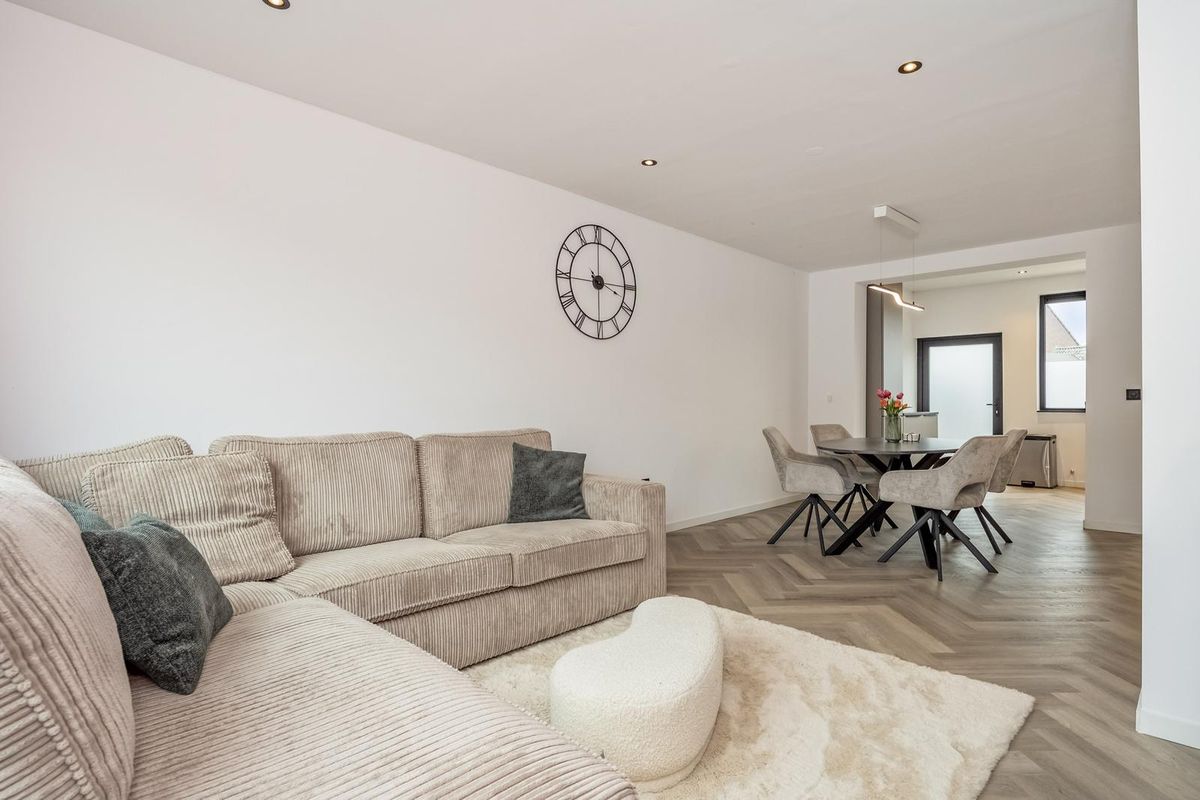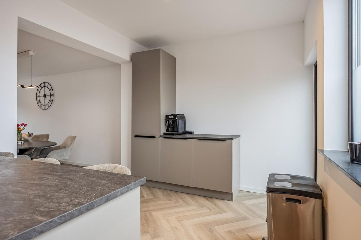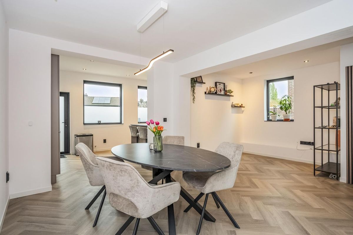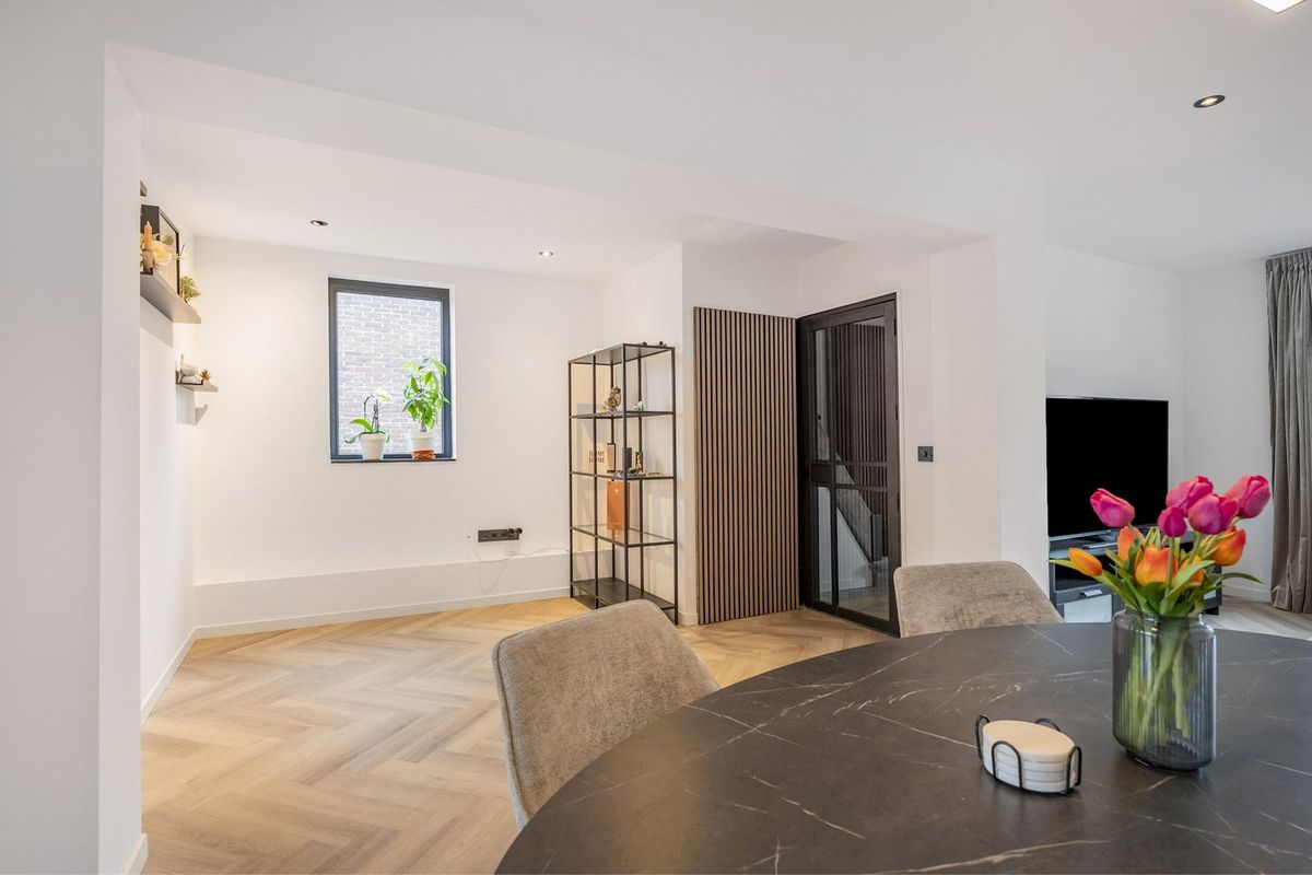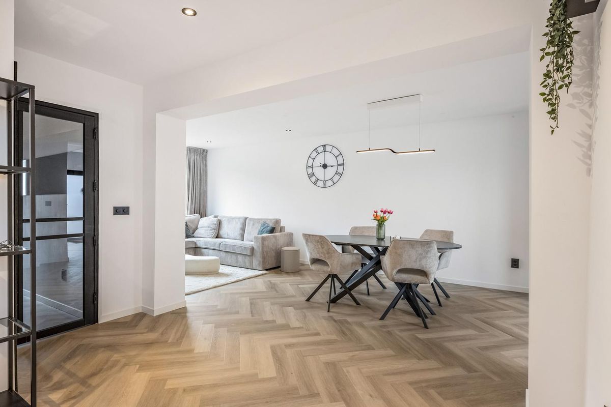 De hal, woonkamer en keuken zijn eigentijds afgewerkt met visgraat pvc-vloeren en glad gestuukte wanden en plafonds.