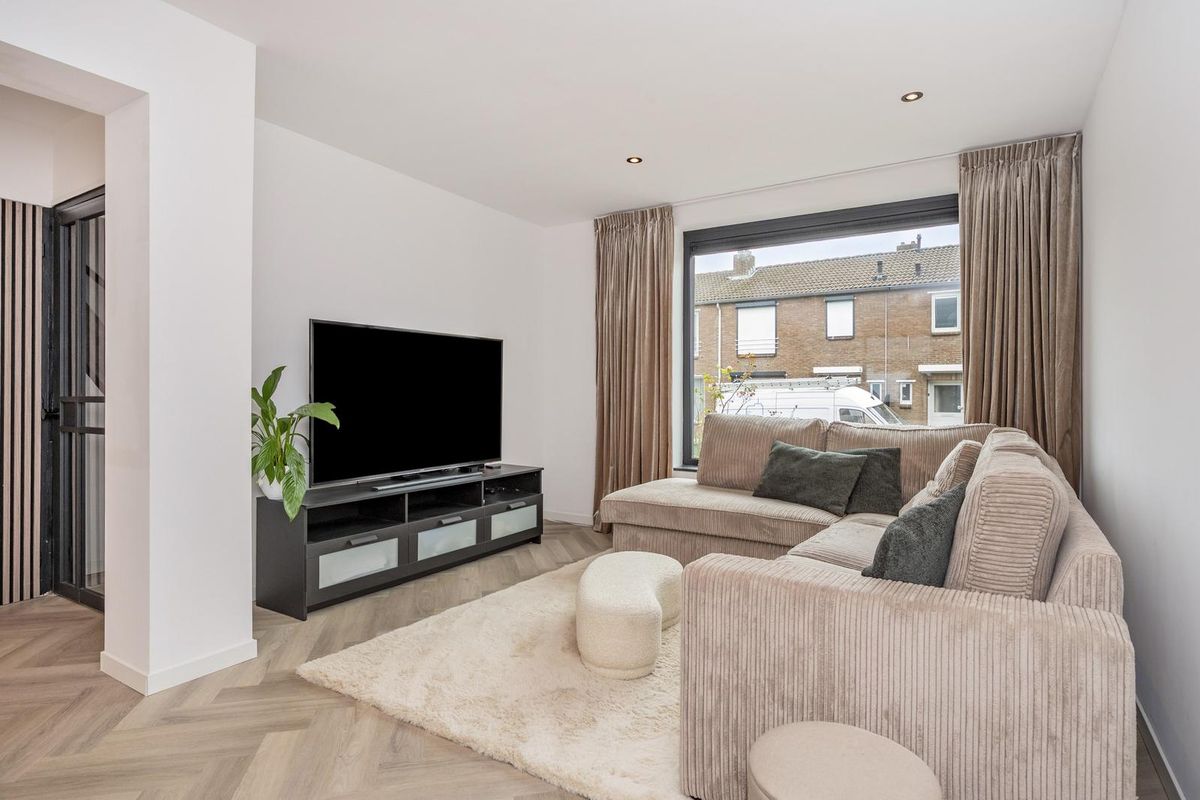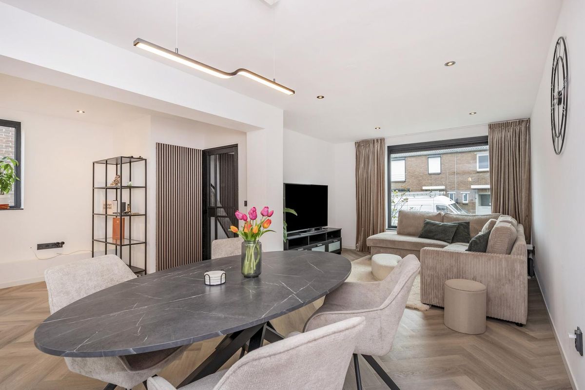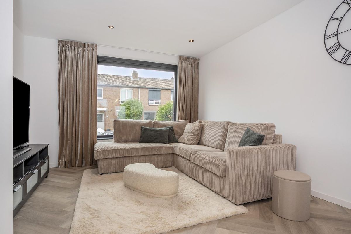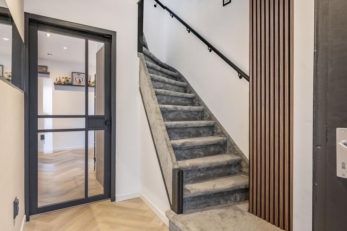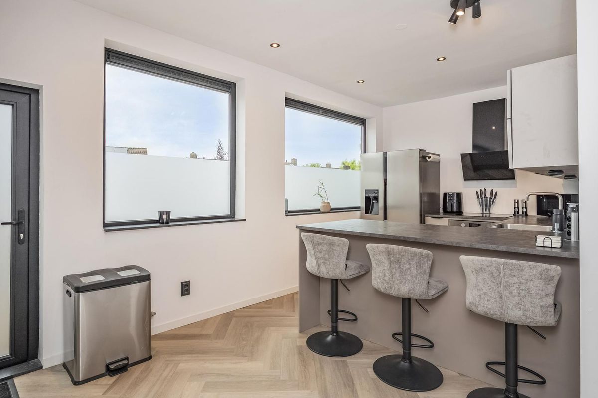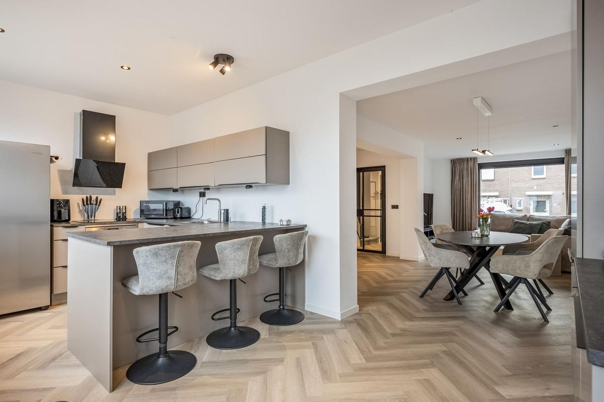 De hal, woonkamer en keuken zijn eigentijds afgewerkt met visgraat pvc-vloeren en glad gestuukte wanden en plafonds.