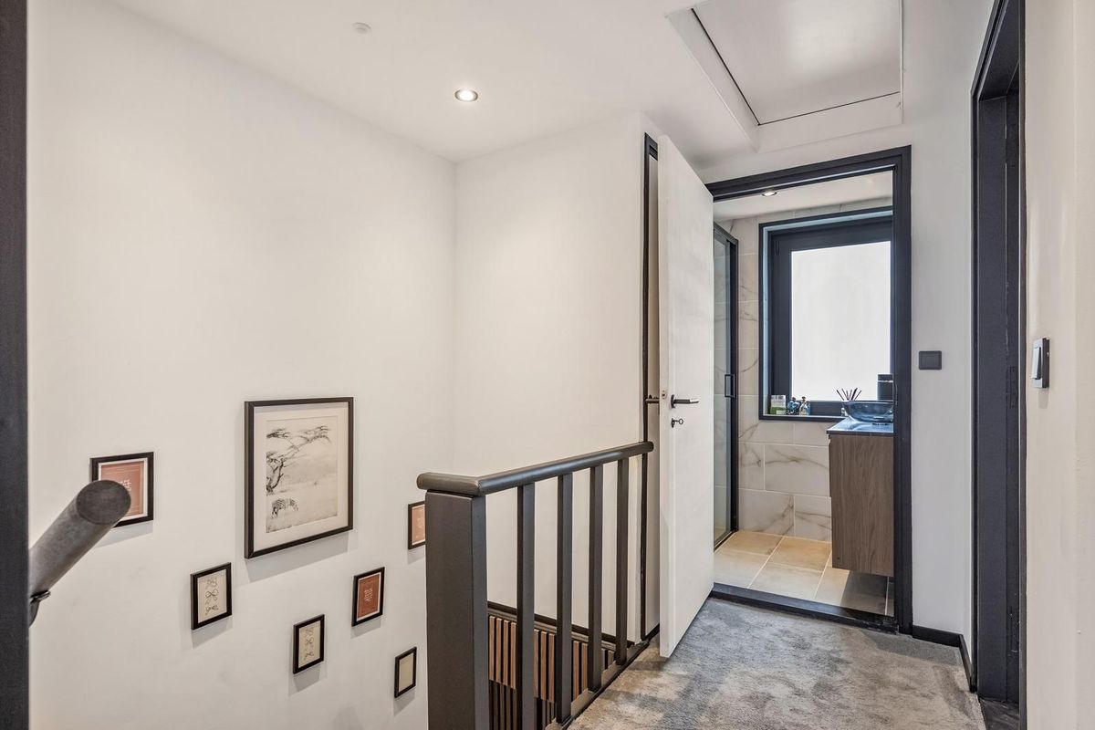 Overloop met vloerbedekking. Slaapkamer 1 (3,76 x 2,90 m), slaapkamer 2 (3,60 x 2,80 m) en slaapkamer 3 (2,79 x 2,74 m). Geheel betegelde badkamer (2,08 x 1,04 m) met inloopdouche en wastafelmeubel. De fraaie, moderne afwerking is ook op deze verdieping consequent doorgevoerd.