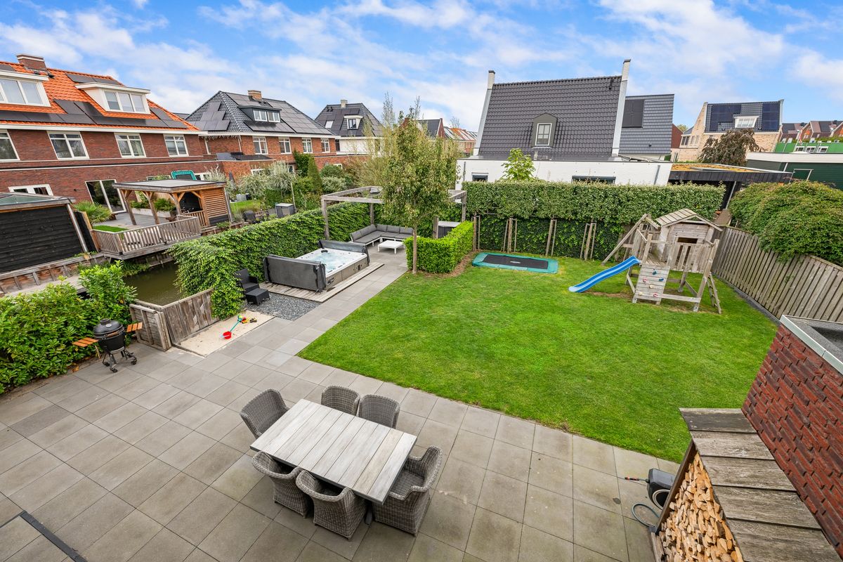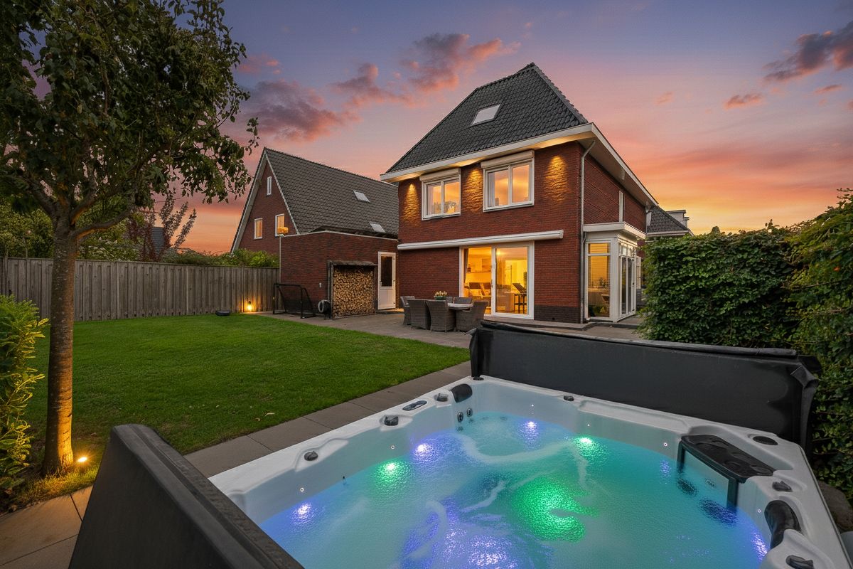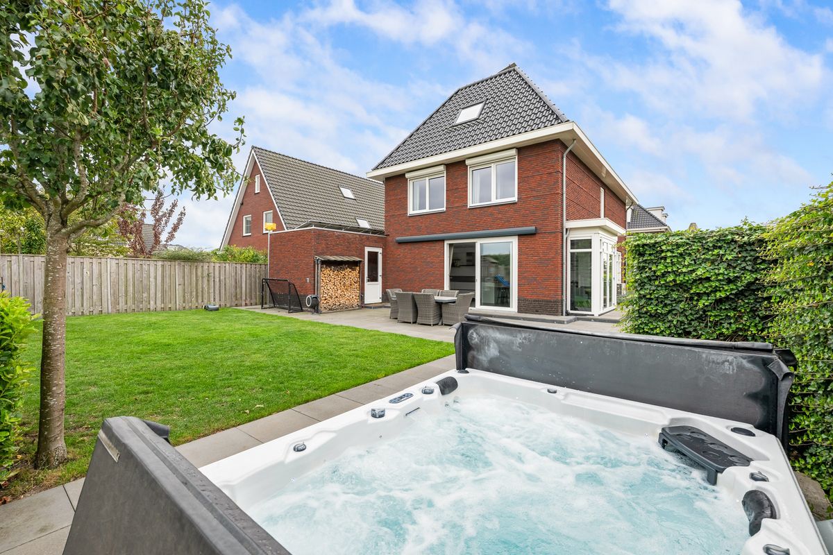 De woning heeft een groene tuin rondom, waarin voor ieder wat wils te vinden is: meerdere terrassen om in de zon of schaduw te zitten, een trampoline en speelhuis voor de kinderen en een jacuzzi om heerlijk te ontspannen. Aan de zijkant grenst de tuin aan het water, waar een vlonder is gemaakt om te vissen of een bootje te water te laten. Aan de voorzijde is ruimte om drie auto’s op eigen terrein te parkeren.