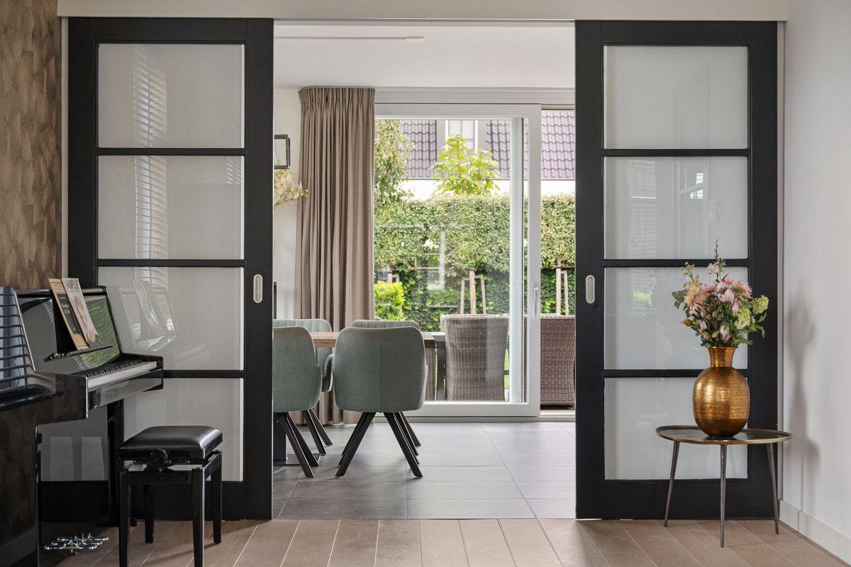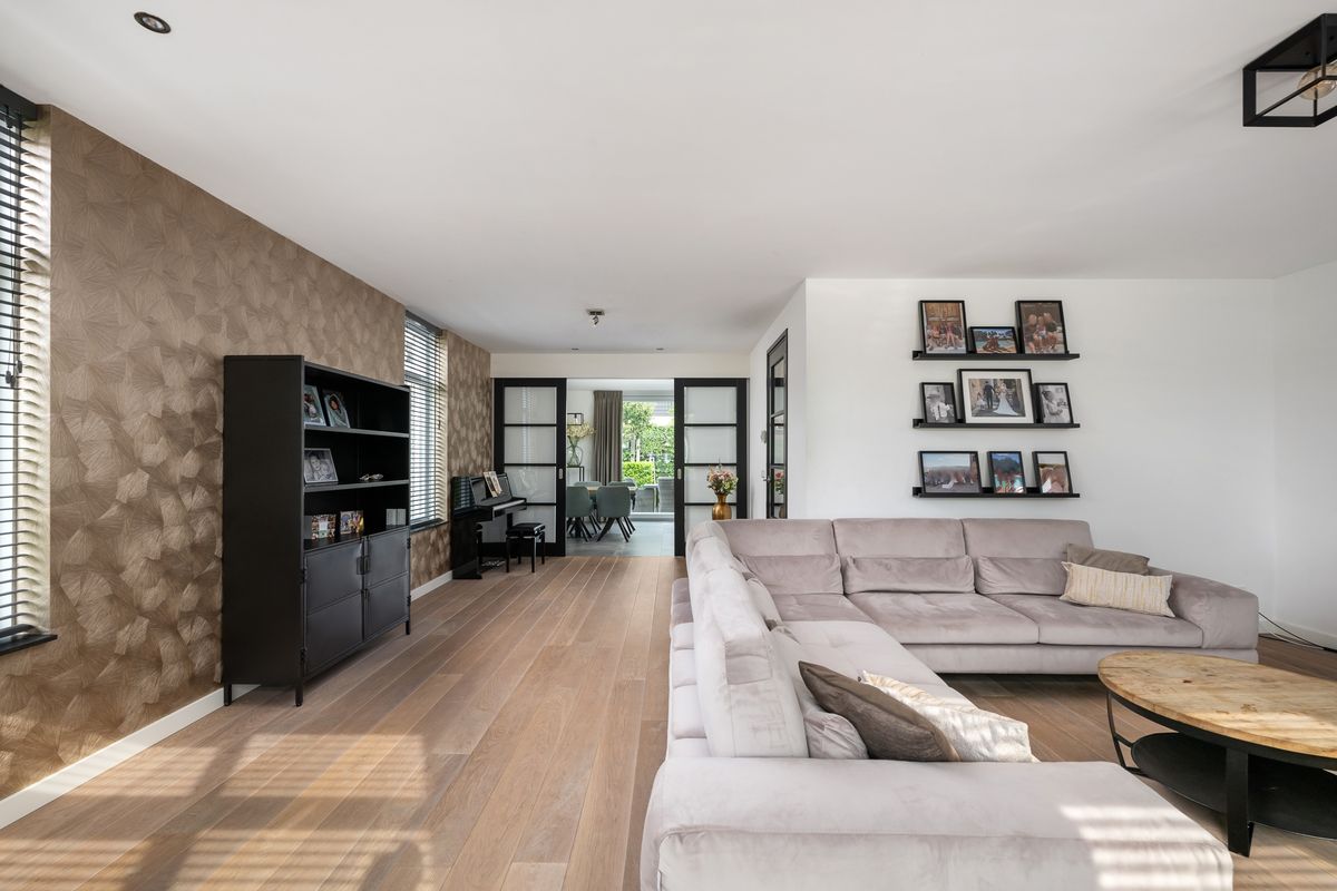 Via de brede schuifpui stapt u zo vanuit de keuken het terras op. Hier bevindt zich een elektrisch breed zonnescherm. Vanuit de keuken is er ook een deur naar de garage, die ruim genoeg is voor voorraad, fietsen en een werktafel. Daarnaast is er een deur vanuit de garage naar de tuin en naar de oprit.