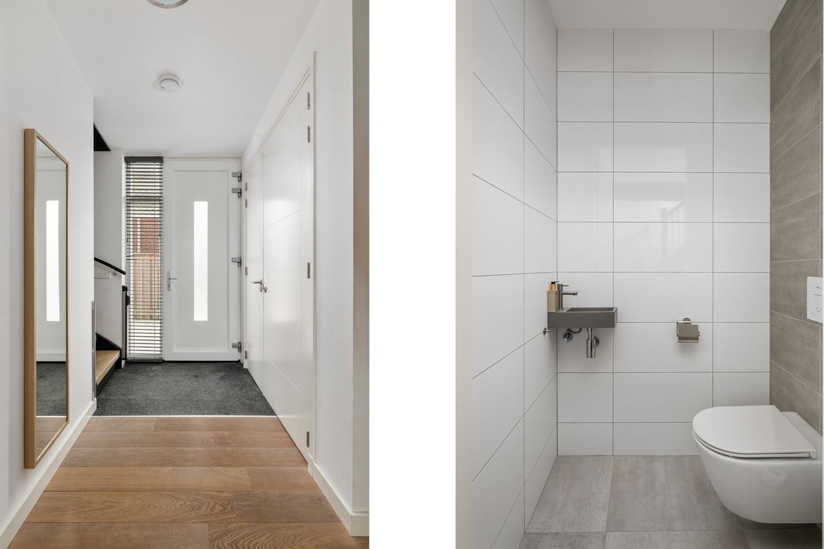 De erker in de woonkeuken met openslaande deuren naar de zijtuin zorgen voor veel licht. De keuken is voorzien van Neff-inbouwapparatuur zoals een koel/vrieskast, combi oven / magnetron, stoomoven, vaatwasser, een inductie kookplaat met afzuiger en een bar om aan te zitten. De gehele begane grond heeft vloerverwarming en strak gestuukte wanden en plafonds.