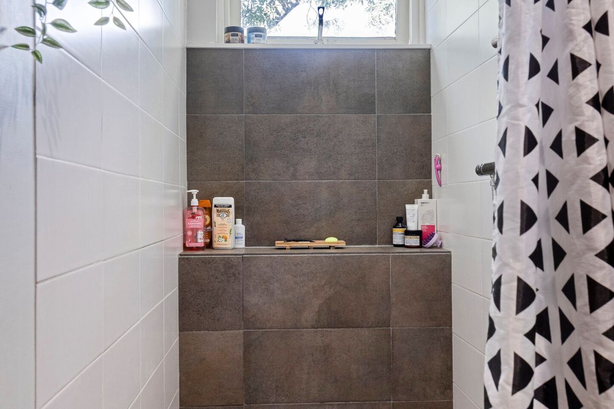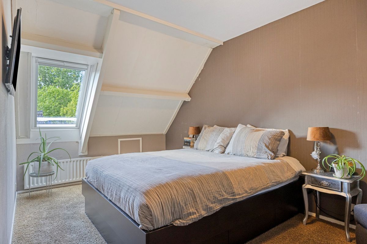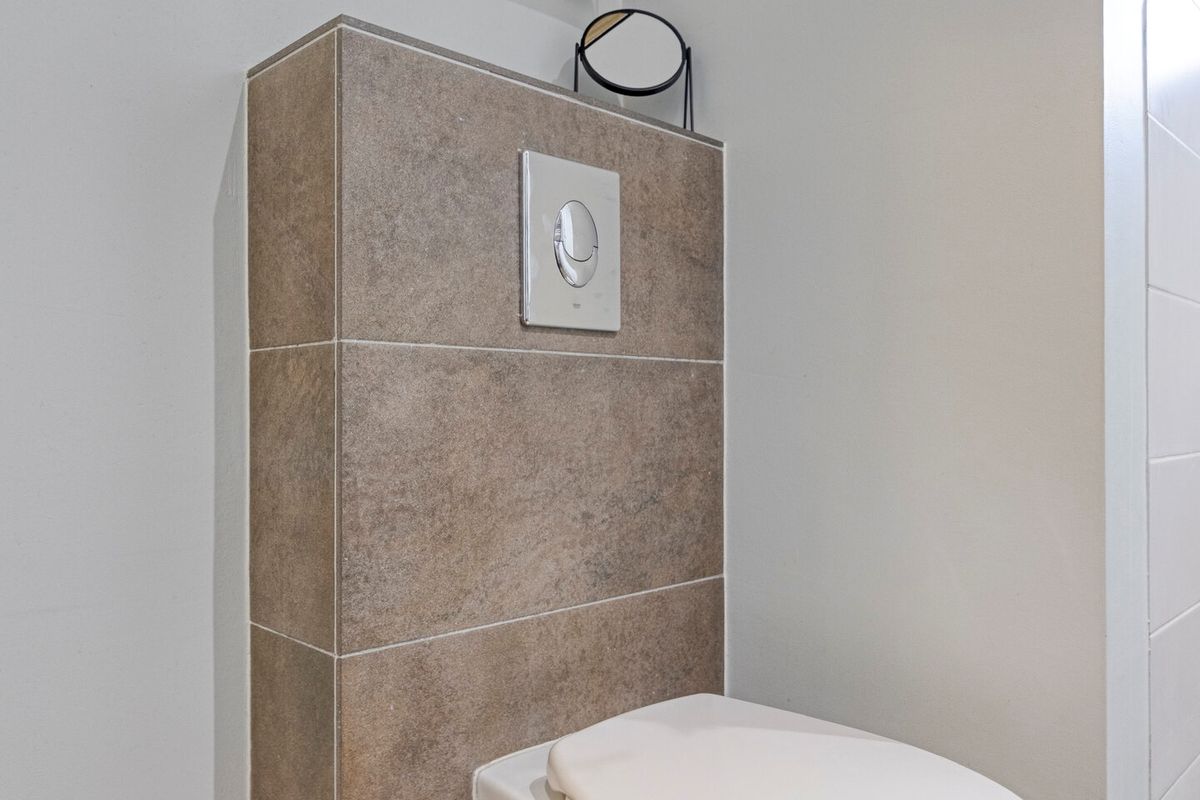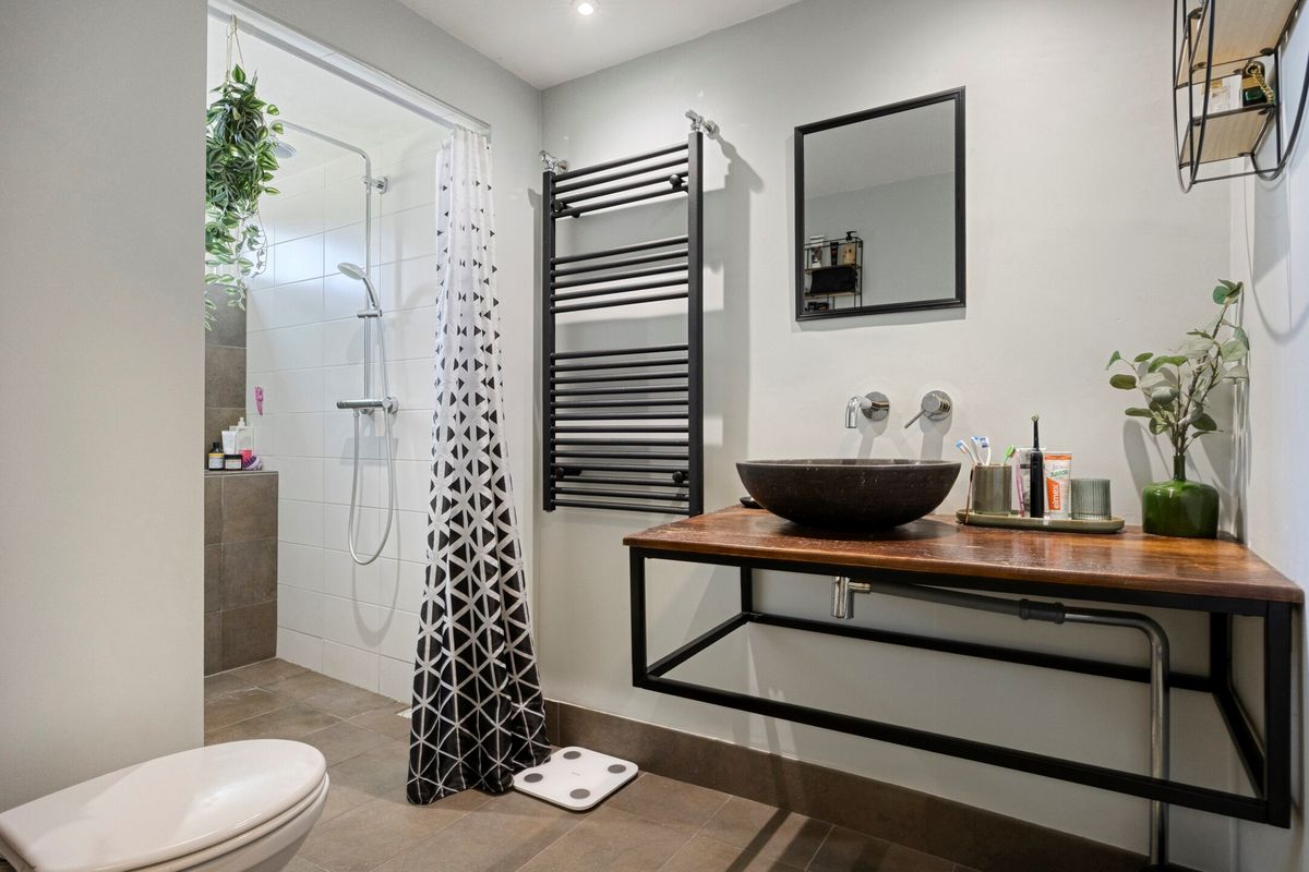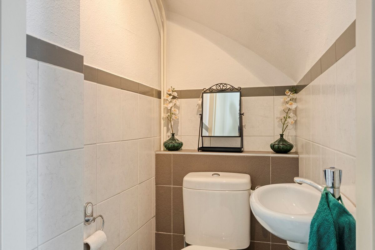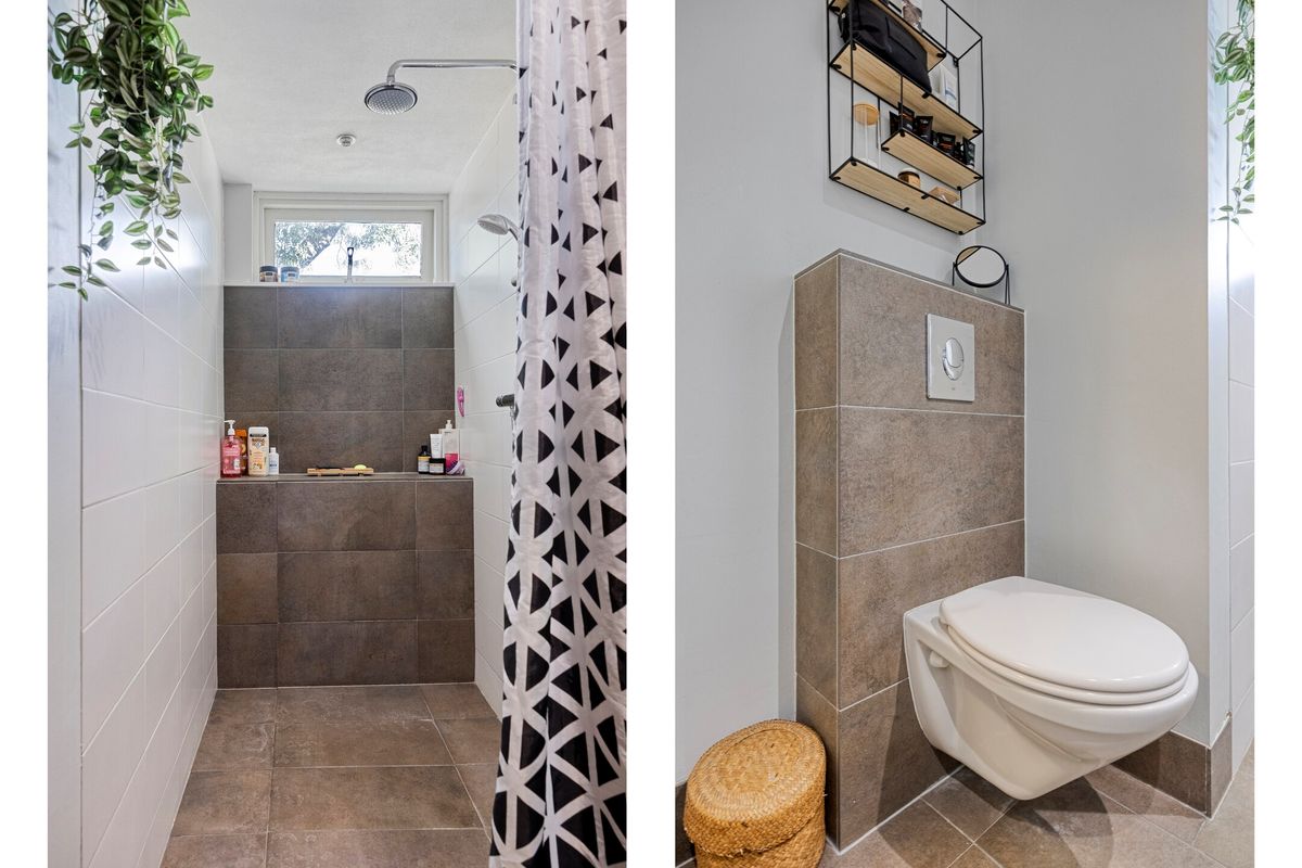Overloop met trap en inpandige berging, twee slaapkamers, badkamer welke is voorzien van een wastafel, douche en 2e toilet.