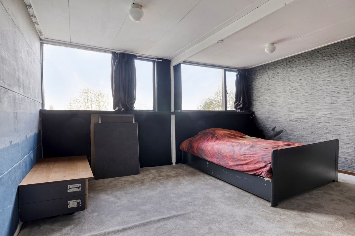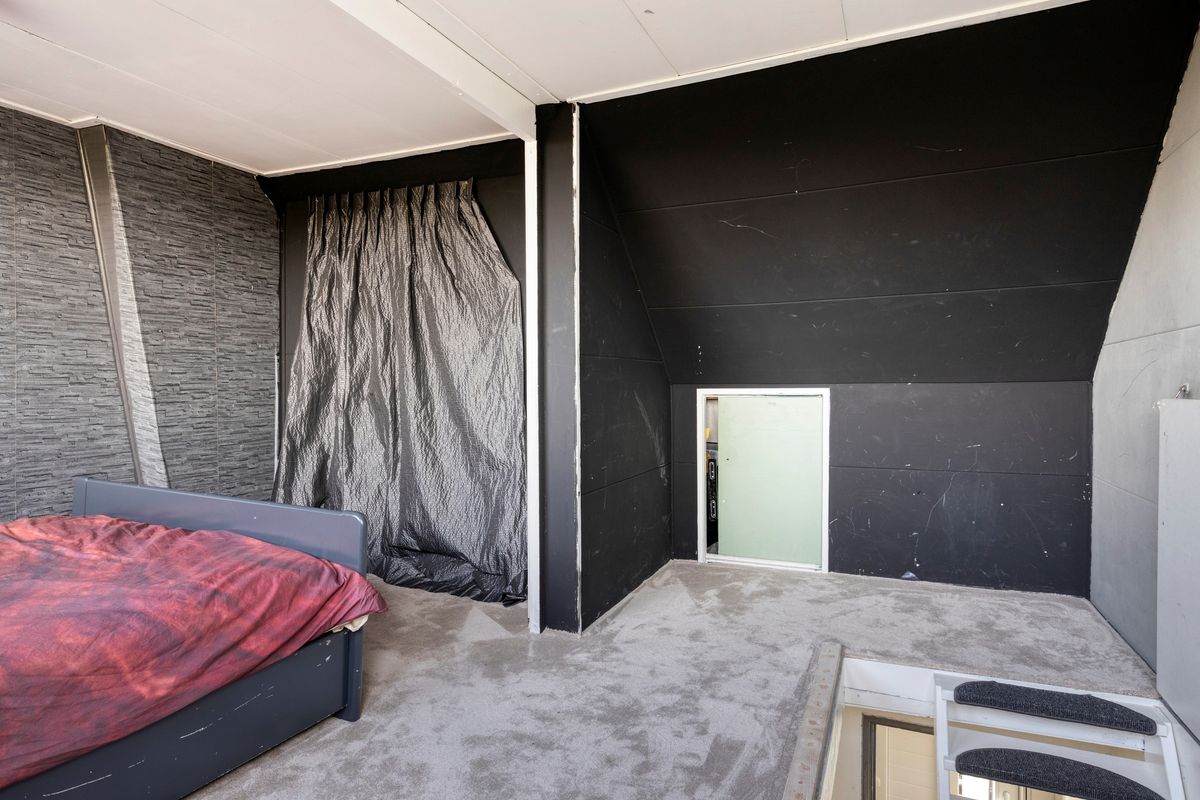 Boven de woonkamer ligt, via een vaste trap bereikbaar, de slaapkamer. Dankzij de dakkapel is dit een relatief ruime en lichte ruimte. De vloer is voorzien van tapijt en er is bergruimte achter de schotten.