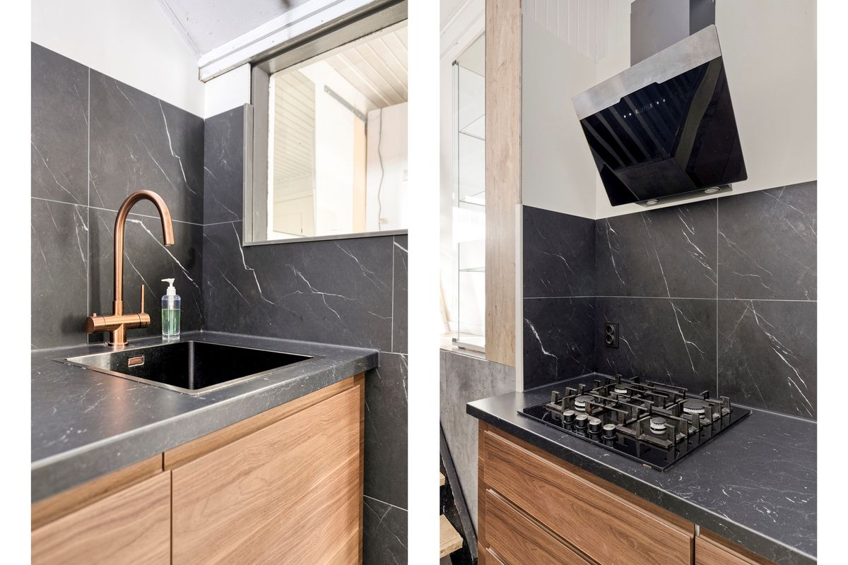 Een trapje lager bevindt zich de keuken. Deze is in 2023 opgeknapt en voorzien van een 4-pits gasfornuis, een moderne afzuigkap en een heet waterkraan (momenteel is de kokend water kraan afgesloten). De ruimte wordt verwarmd met een gaskachel.