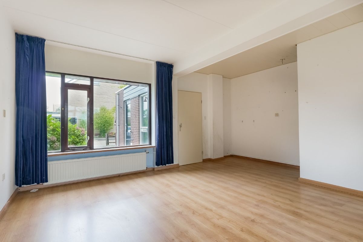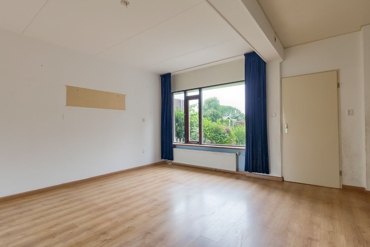 Entree/hal met toegang naar berging, toilet, meterkast. Woonkamer met trapopgang en trapkast, eenvoudige keuken.