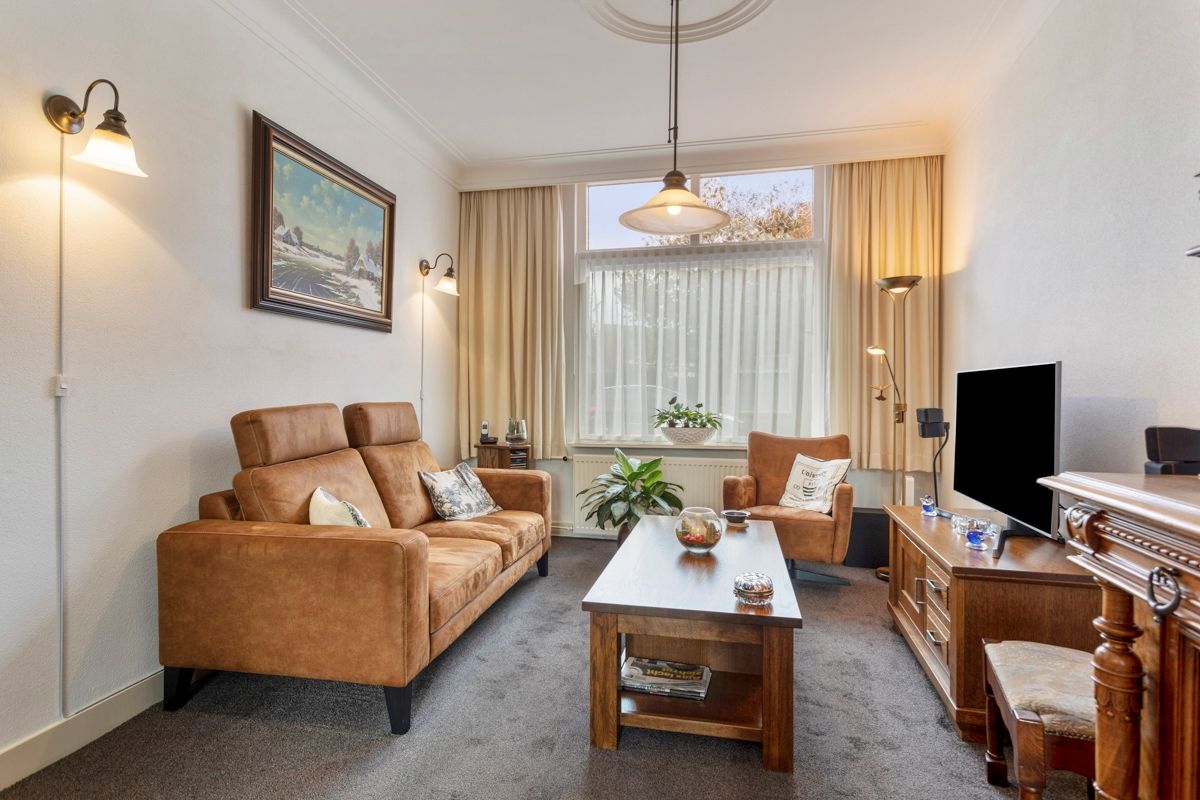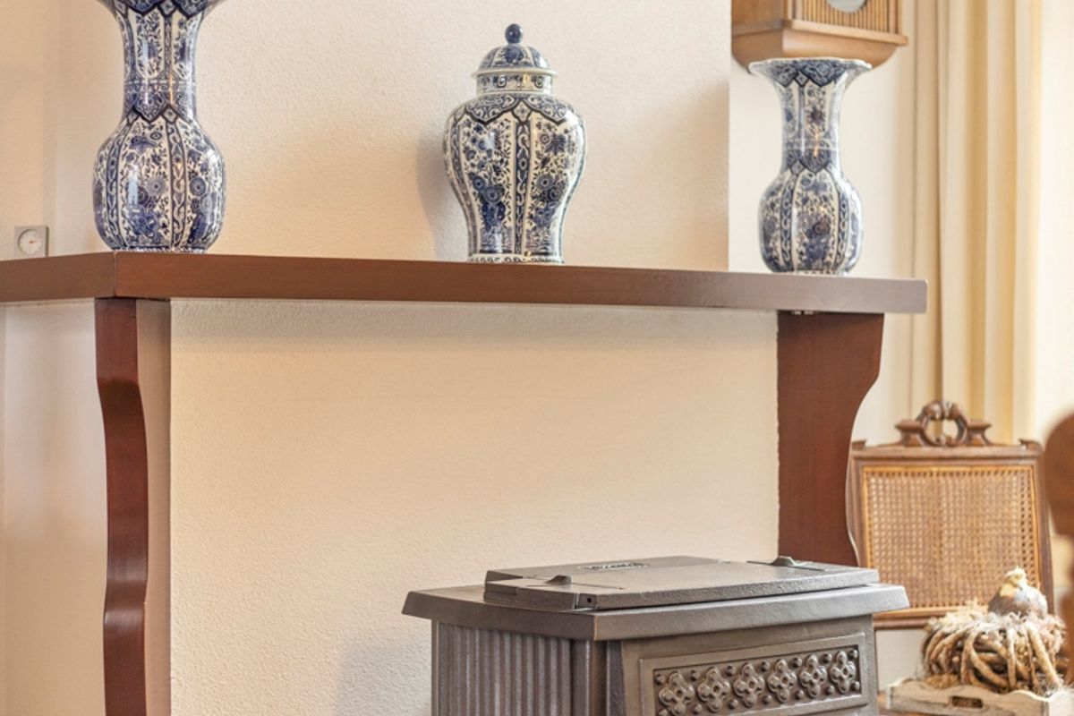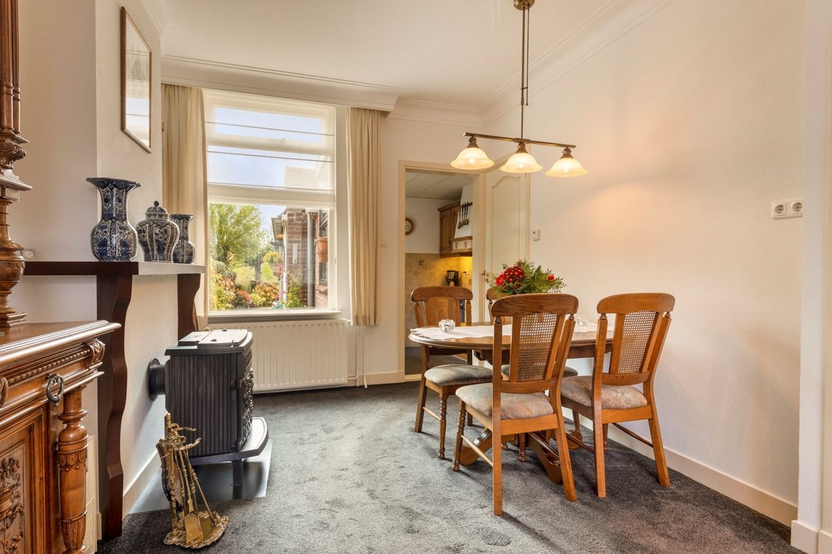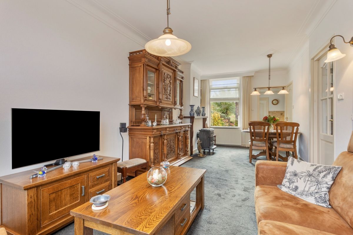 In de doorzonkamer van ca. 7.60 x 4.40m. is een houtkachel toegang tot een kelder-/trapkast en doorgang naar de half open keuken.