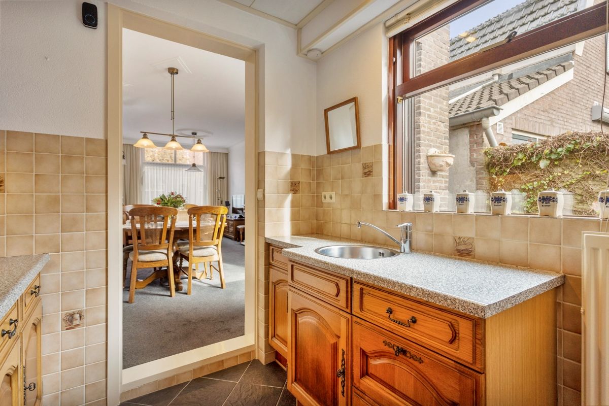 De keuken heeft aan de raamzijde een rvs spoelbak met werkblad en onderkastjes en aan de muurzijde een aanrechtblad met een keramische vier pits kookplaat, afzuigkap, een combi magnetron en diverse onder en bovenkastjes. Via een deur in de keuken kom je in een portaal. Via dit portaal kun je of naar de achtertuin, het toilet of de bijkeuken. In de bijkeuken staan opgesteld: de CV-combiketel, de wasmachine, de wasdroger, koel- en diepvries en een vaste schuifkast. Via de bijkeuken kom je in de badkamer welke voorzien is van een douche en een wastafelmeubel. Een luik en vlizotrap in de bijkeuken geven toegang tot een ruime bergzolder.