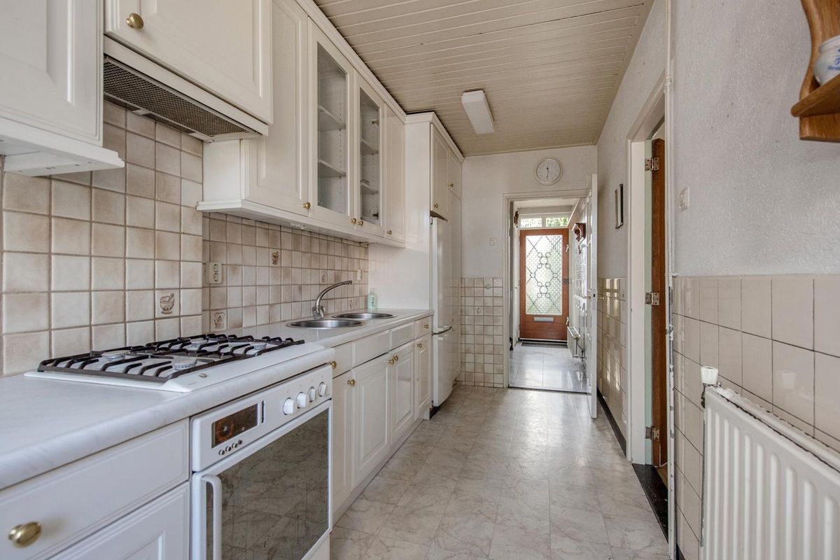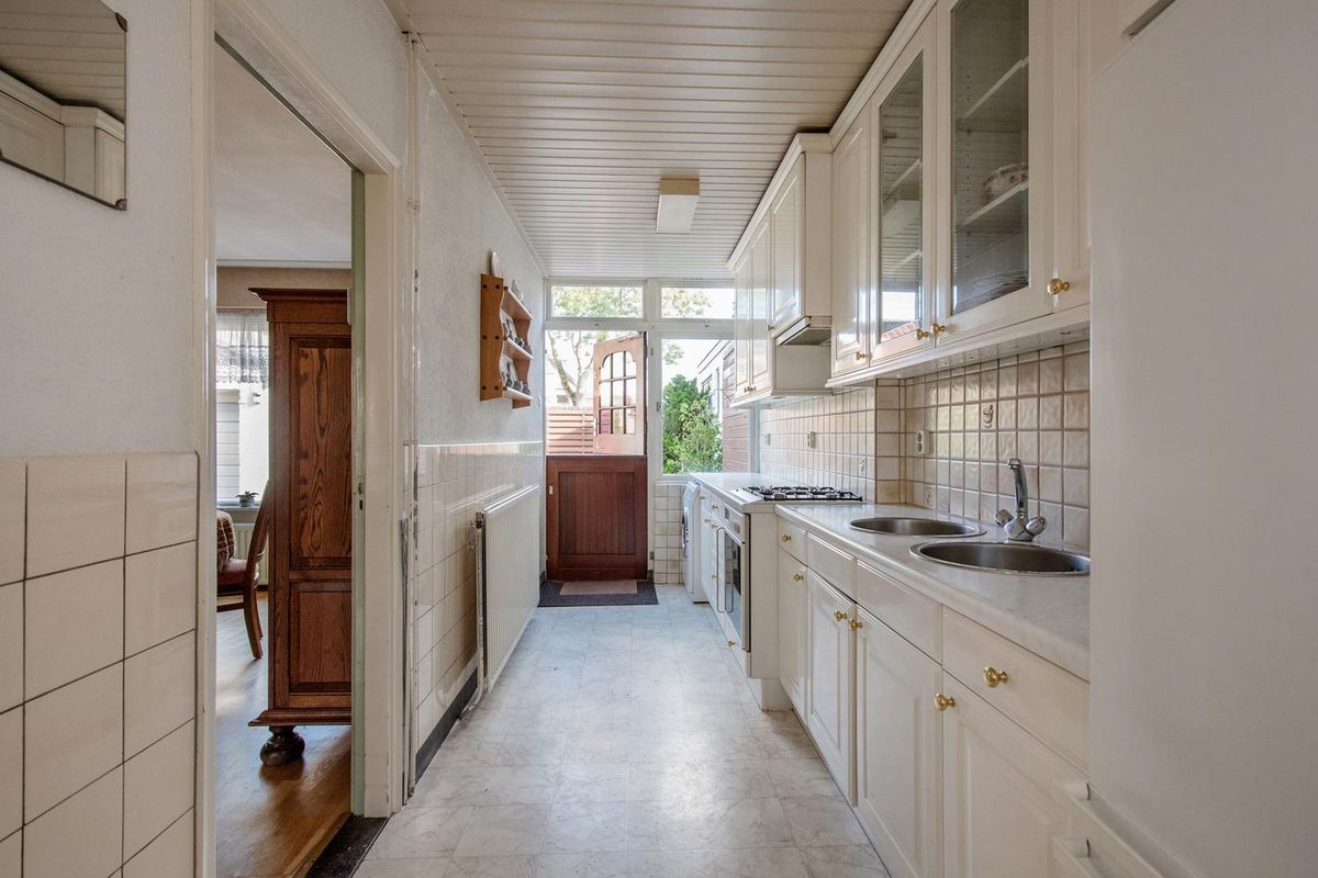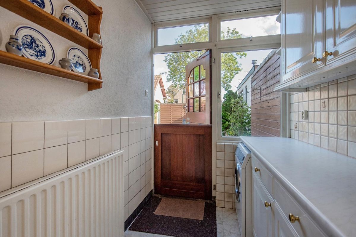 Entree via de voortuin met oprit. Hal met meterkast, aparte toiletruimte, trapopgang naar boven en doorgang naar de keuken. In de keuken staan verschillende losse apparatuur en bevinden zich ook de aansluiting voor de wasmachine en opstelplaats van de CV-ketel (Nefit, ca. 2011, huur). Vanuit de keuken bereik je via een boerendeur de achtertuin. De achtertuin ligt op het noordoosten, is deels betegeld en deels voorzien van groenborders. Er is een stenen garage waar de auto in geparkeerd kan worden, met een aangebouwde berging aan de achterzijde. Door de voor-, zij- en achtertuin is er veel ruimte om van het buitenleven te genieten.
