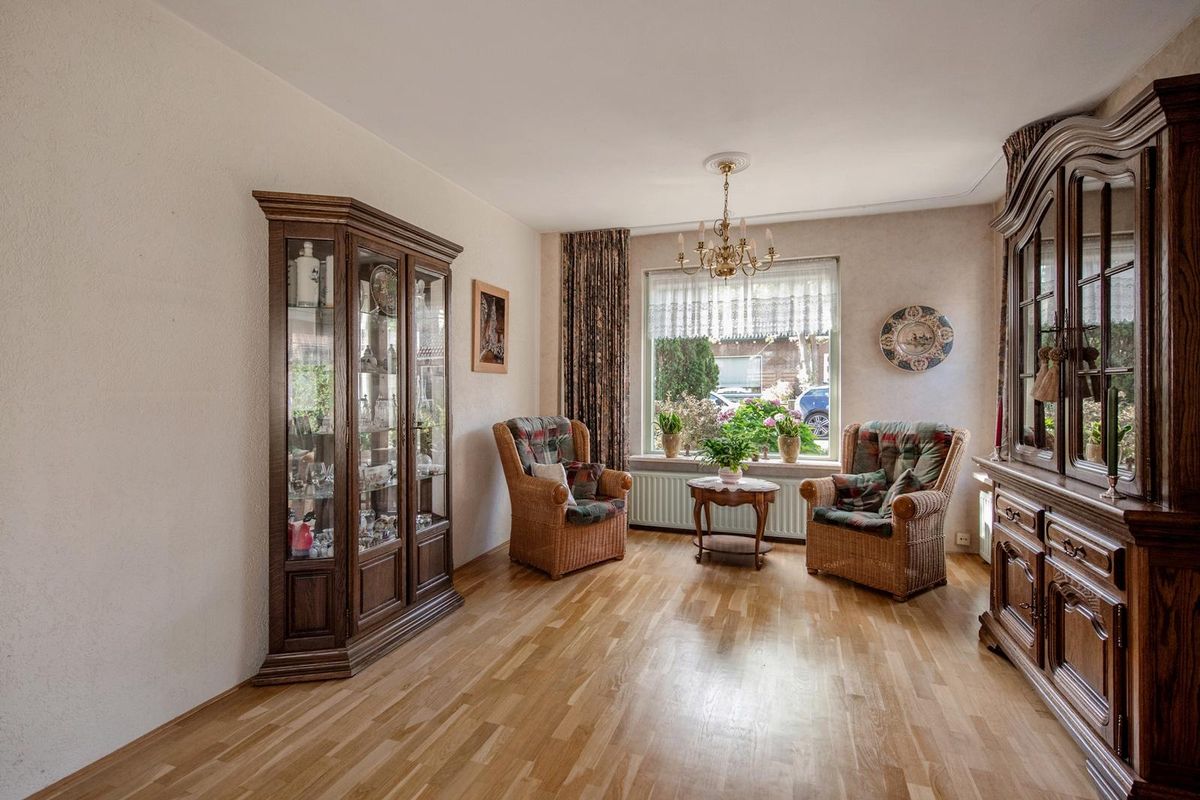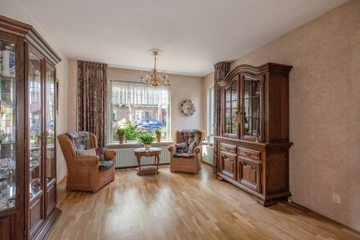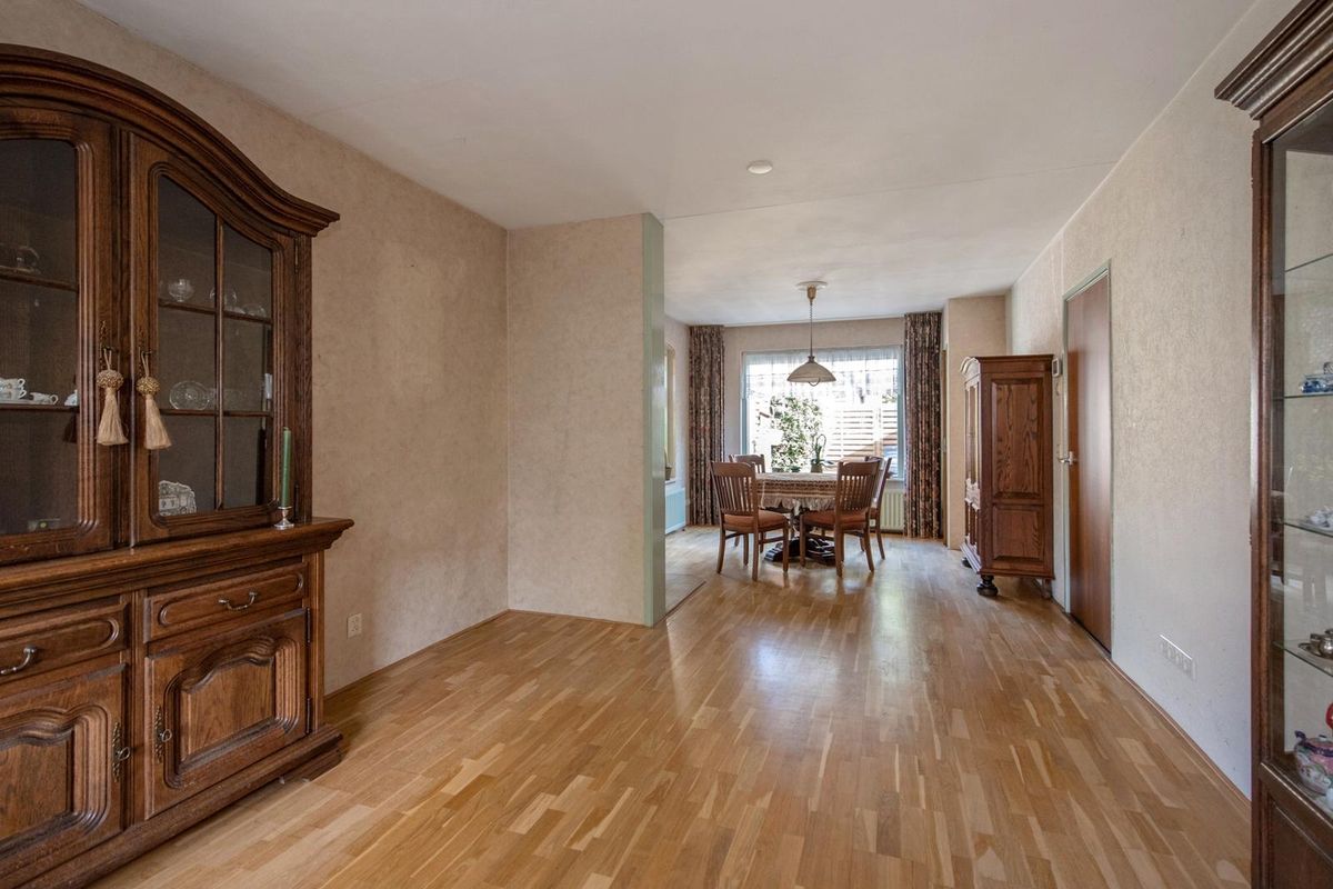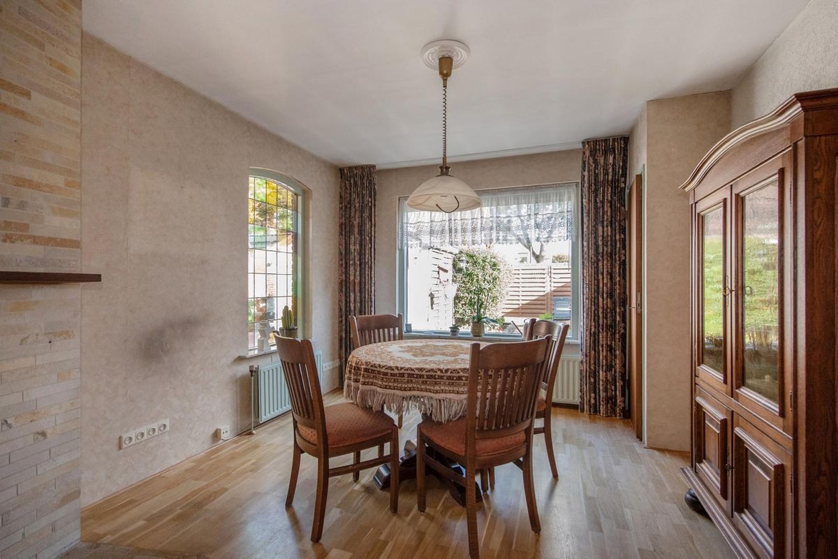 Terug via de keuken bereik je de woon- en eetkamer. De woonkamer is uitgebouwd aan de achterzijde, afgewerkt met een parketvloer en behang op de wanden en er is een vaste kast. Door grote ramen aan de voorzijde, achterzijde en zijkant is er veel natuurlijke lichtinval.