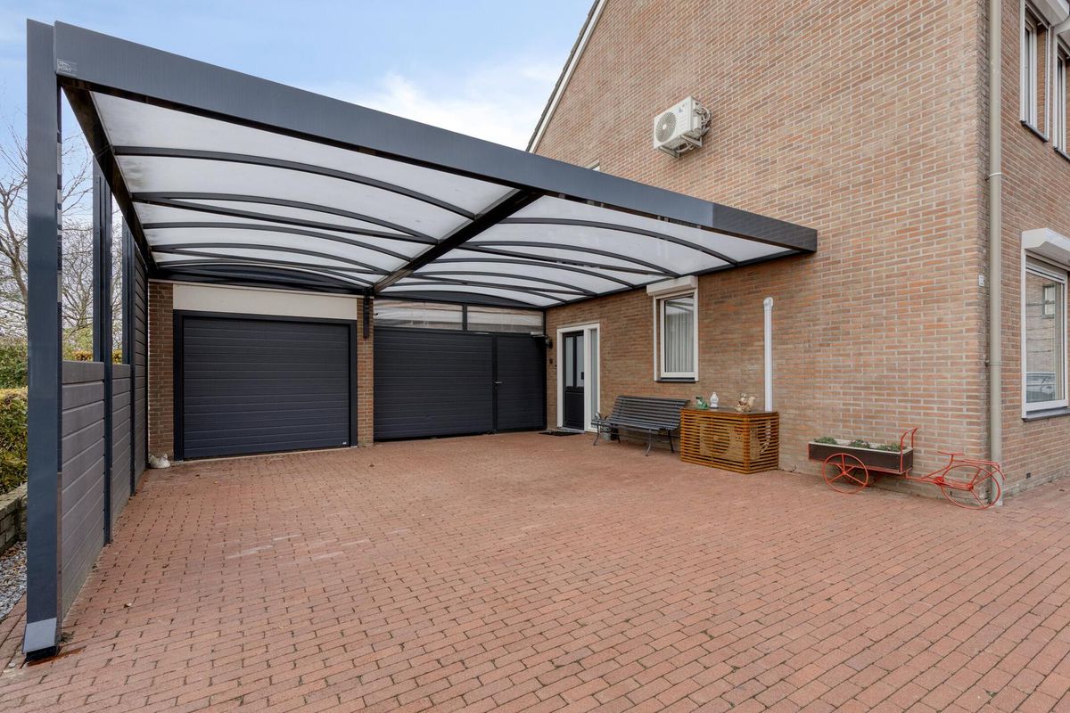 De zonnige achtertuin ligt op het westen, is fraai aangelegd en van alle gemakken voorzien. Direct naast de woning bevindt zich een ruime overkapping die toegang biedt tot de garage, uitgerust met een elektrische segmentdeur en een loopdeur naar de tuin. Achter de garage vind je een praktische fietsenberging met uitstortgootsteen, elektra en een voormalige toiletruimte. Helemaal achterin de tuin staat een dubbele houten berging, eveneens voorzien van elektra – ideaal voor extra opslag.