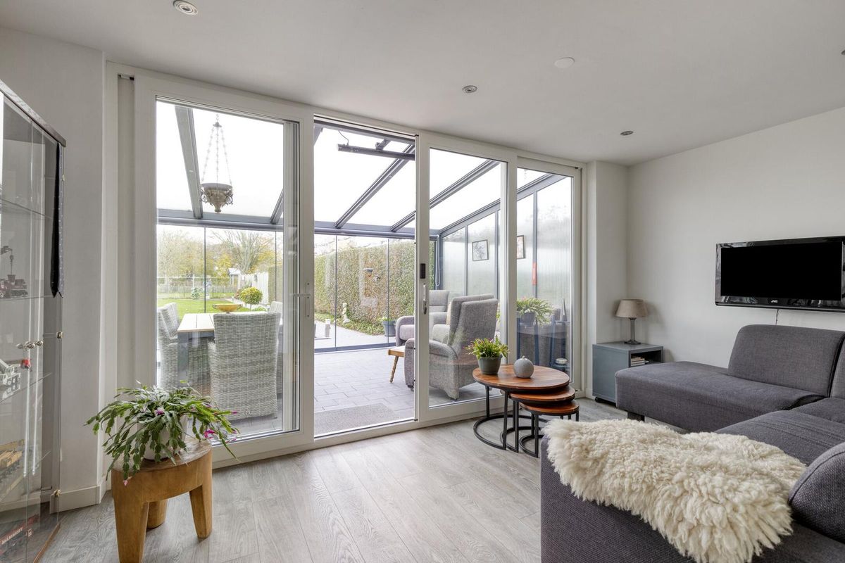Aansluitend aan de keuken ligt een tuinkamer, die zich uitstekend leent als speel- of hobbyruimte. Vanuit hier heb je toegang tot de overkapping en de serre, die is voorzien van screens, verlichting en een schuifbare glazenwand waardoor binnen en buiten mooi in elkaar overlopen.