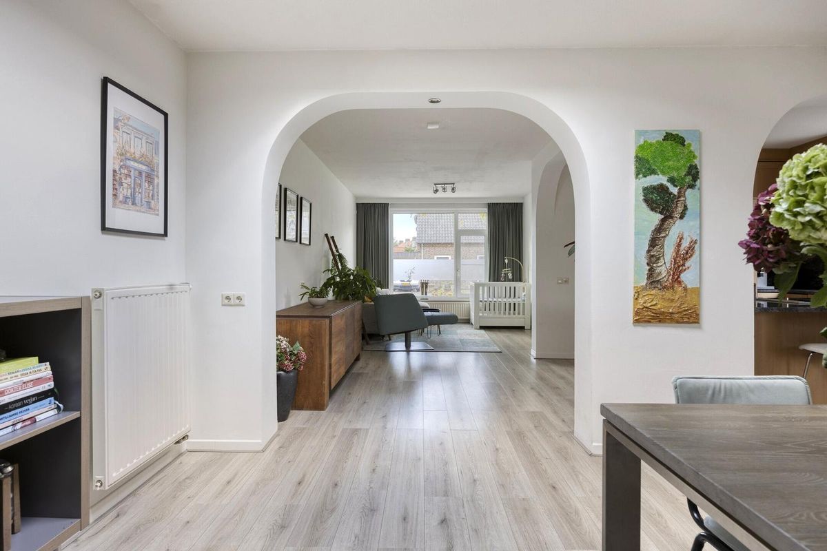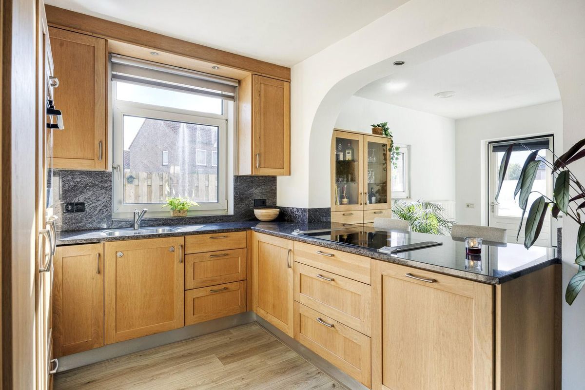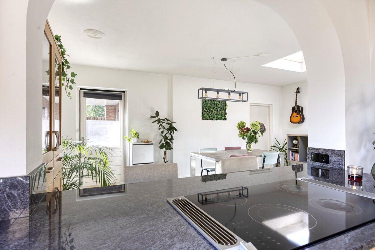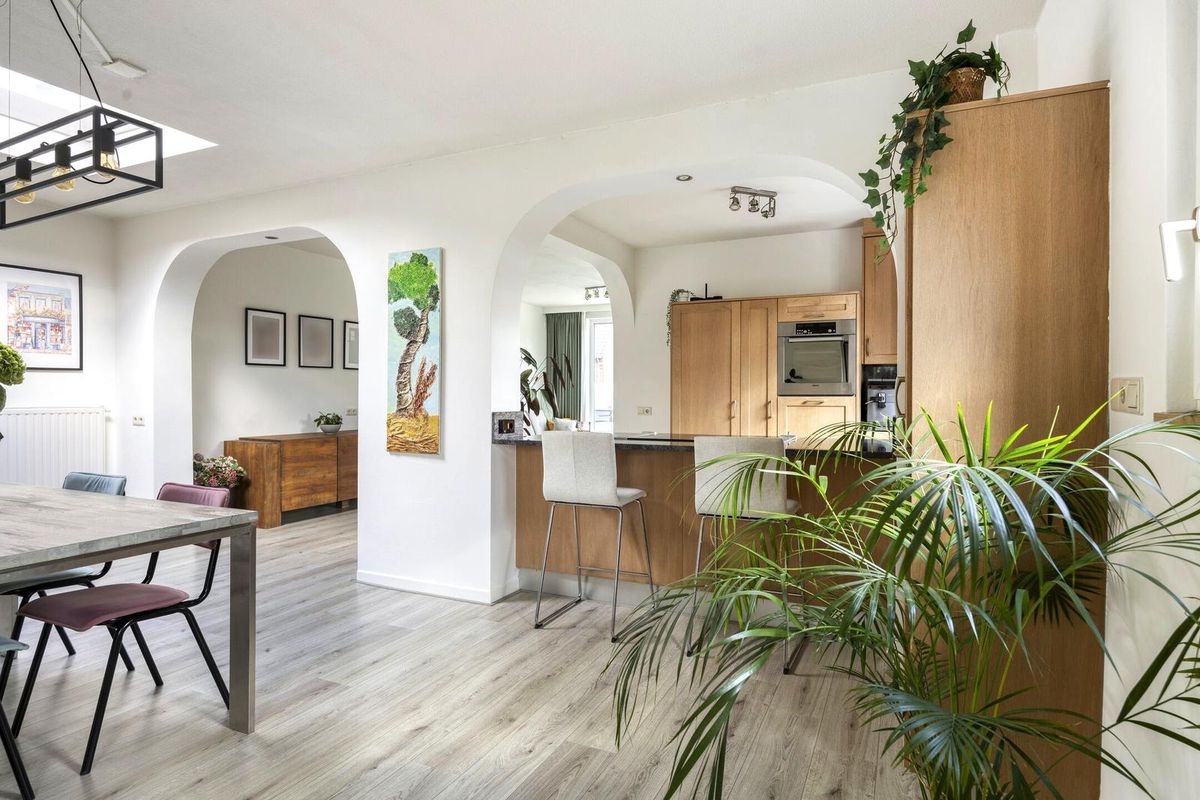 Bij binnenkomst valt direct de lichte en moderne uitstraling op. De woonkamer is strak afgewerkt met een glad plafond, gestucte wanden en een onderhoudsvriendelijke vloer. Dankzij de open verbinding met de keuken en eetkamer is er een royale leefruimte ontstaan, die uitnodigt tot gezellig samenzijn. De achterkamer is voorzien van een lichtkoepel, waardoor het geheel extra ruimtelijk en licht aanvoelt. De open keuken is voorzien van een granieten werkblad en achterwand, apothekerskast en beschikt over diverse inbouwapparatuur. Doordat de keuken in open verbinding staat met de eetkamer, is de keuken ook te gebruiken als een eetbar. Vanuit de keuken/eetkamer is er toegang tot de garage en de ruime kelder onder de garage. De gehele begane grond is voorzien van laminaat.