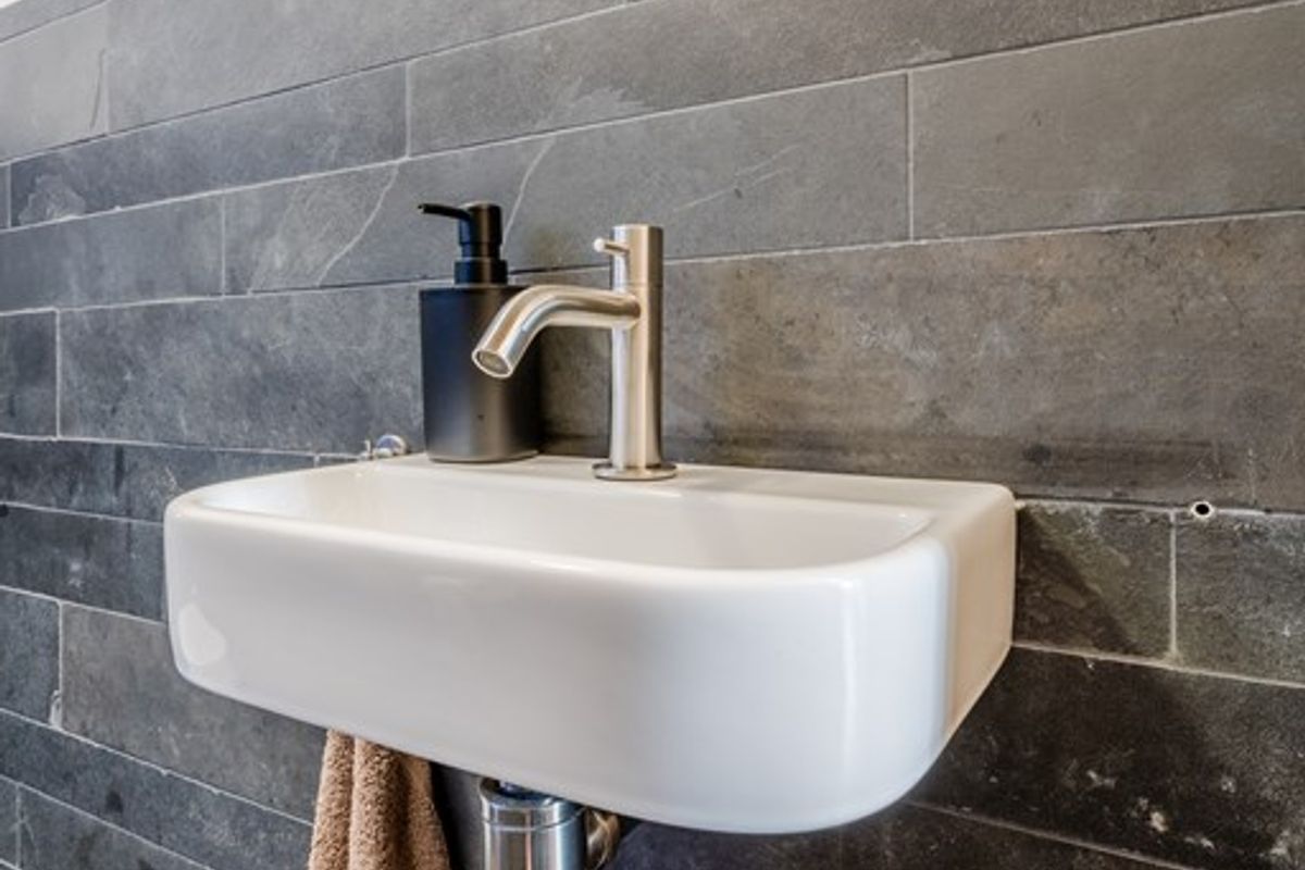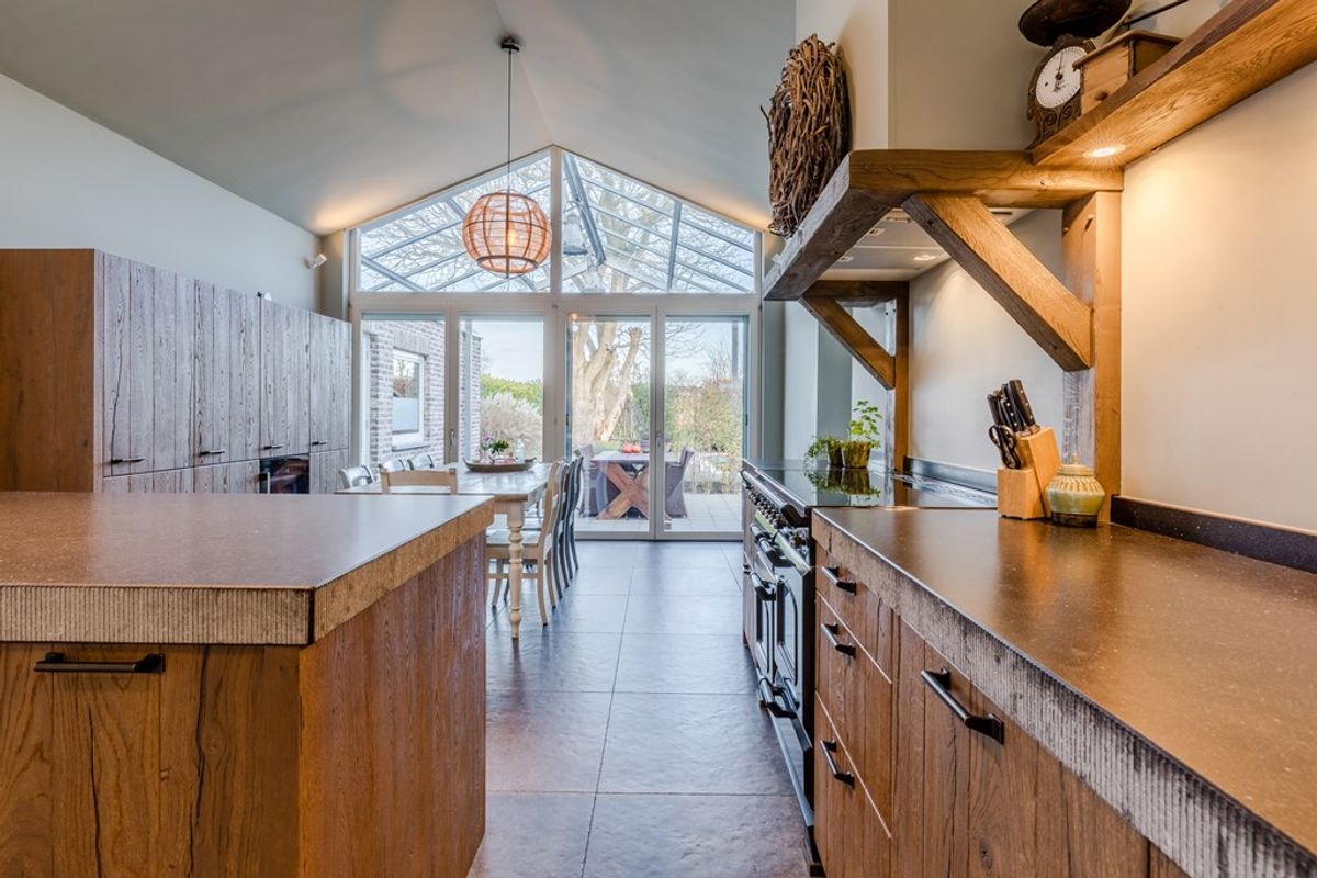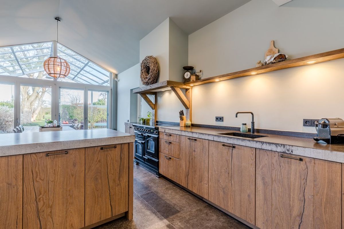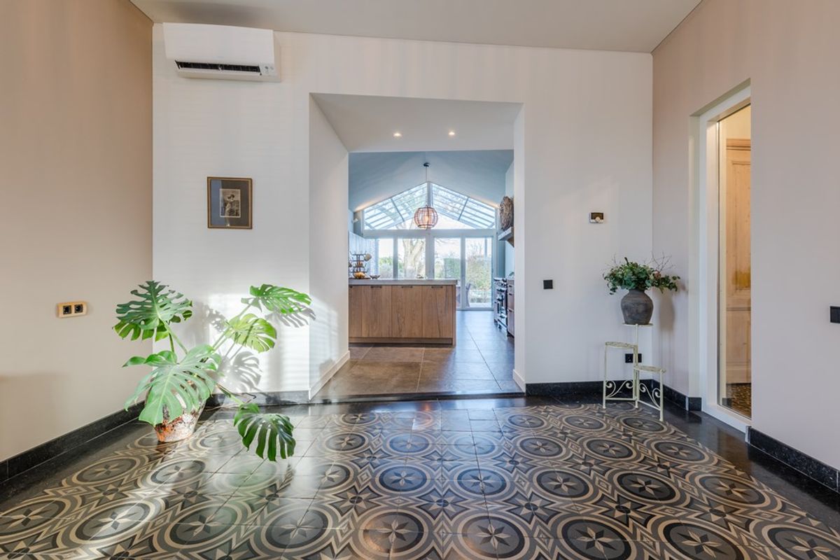 Fraaie hal (10 m²) met authentieke tegelvloer, sfeervolle woonkamer (34 m²) met eveneens een authentieke tegelvloer en schouw, riante woonkeuken (27 m²) met een luxe inbouwkeuken v.v. een werkeiland, inductiekookplaat, dubbele oven, koel-/ vriescombinatie, vaatwasser, wijnkoelkast en een hardstenen aanrechtblad, een kantoor/slaap-kamer (18 m²), de nieuwe (2024) luxe badkamer (10 m²) met ligbad, inloopdouche, dubbele wastafel en zwevend toilet alsmede de serre (13 m²).