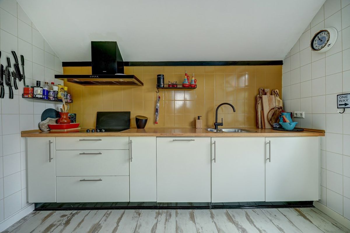 De indeling is als volgt: entree, hal, toegang tot de ruime eetkamer (536 x 588/427) met houtkachel, tweede entree (uitkomend op het balkon/terras), trapopgang, trap naar het souterrain en toegang tot het toilet, de bijzonder sfeervolle royale split level woonkamer (858 x 446 met airco) en de keuken (339 x 328) met nette inbouwkeuken en toegang tot de bijkeuken/binnen berging (328 x 088) met c.v.-opstelling. Er zijn tal van authentieke details bewaard gebleven en er is een hoge mate van lichtinval in de woning.