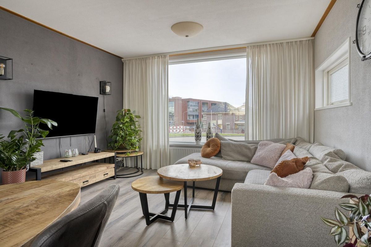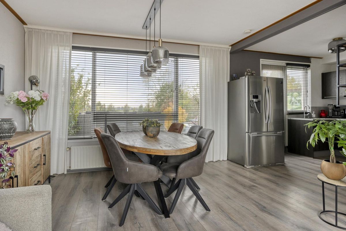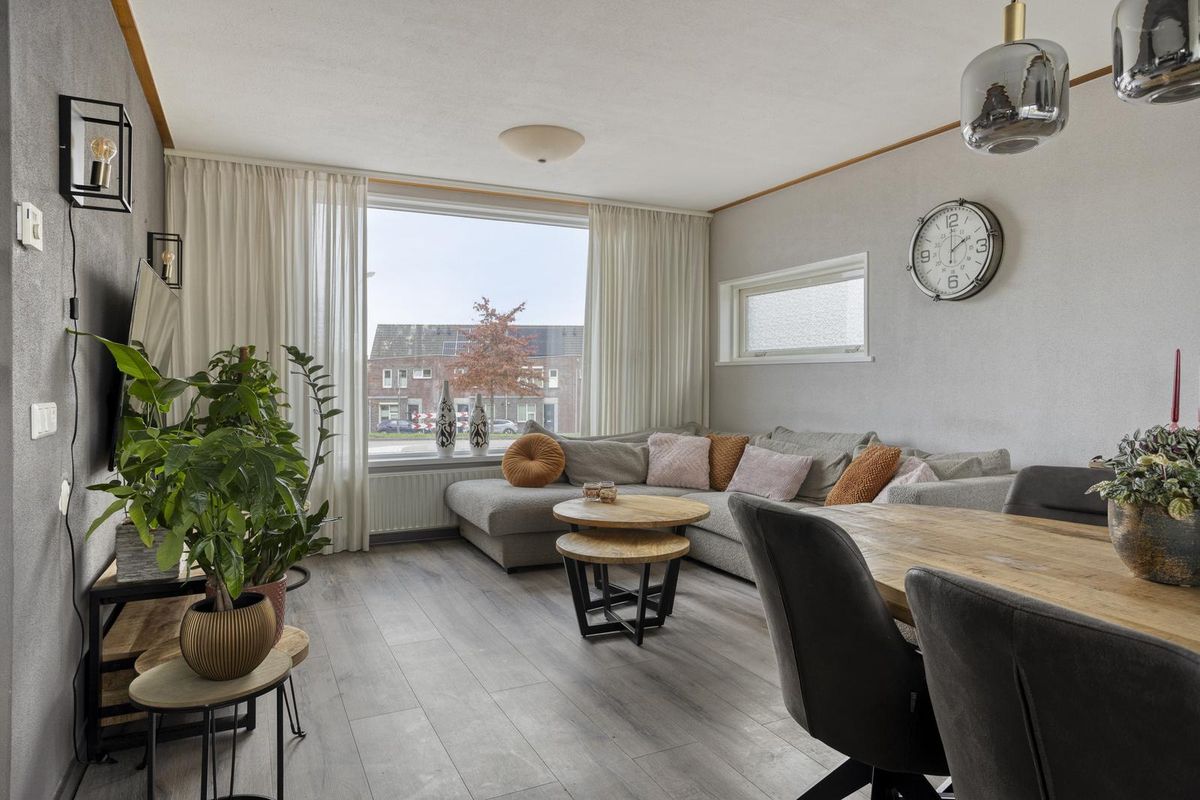 De lichte woonkamer heeft grote raampartijen aan zowel de voor- als achterzijde, wat zorgt voor een heerlijk lichte leefruimte met uitzicht over de dijk en de tuin.
