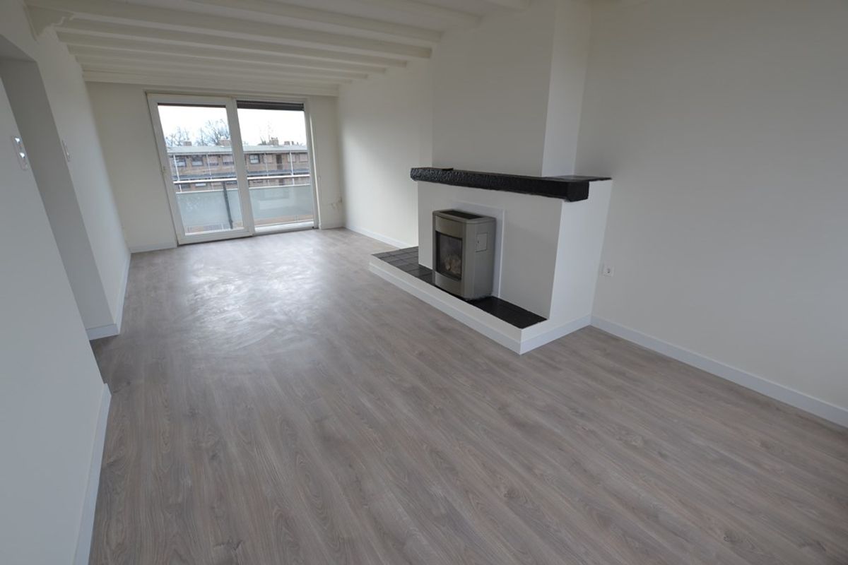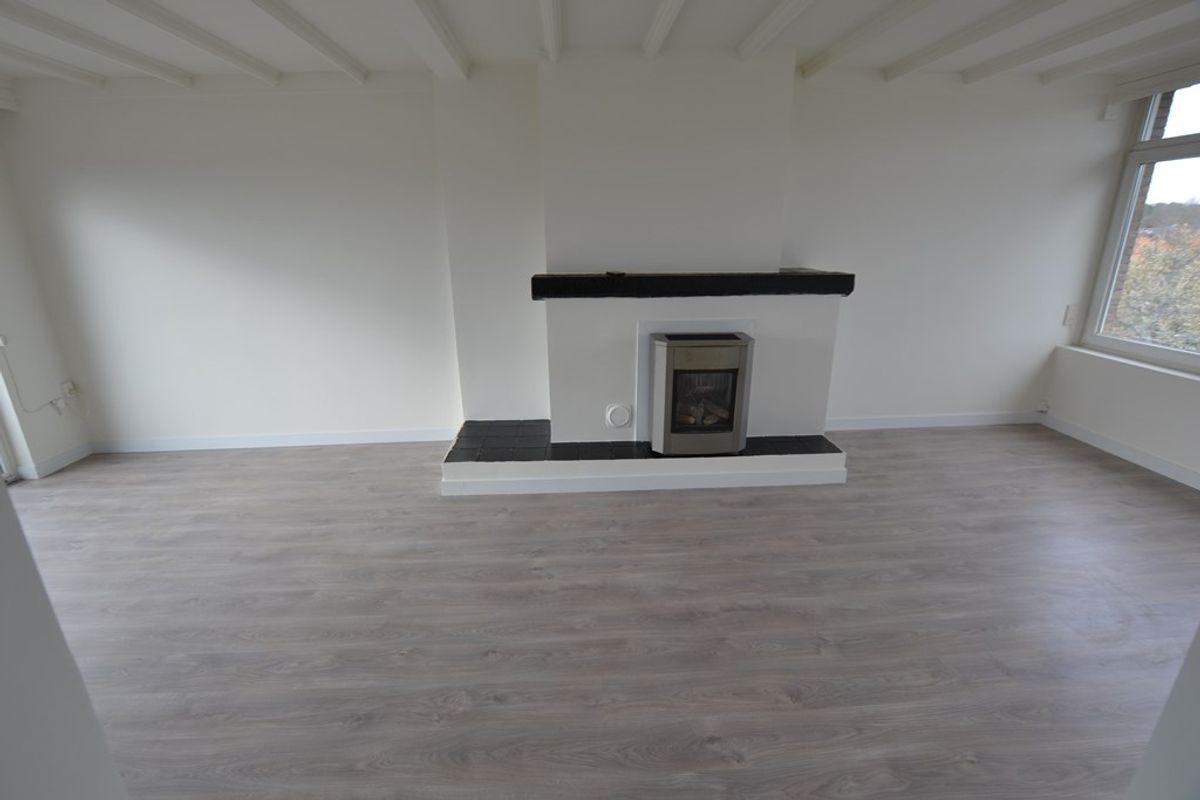 Woonkamer 7,65x3,55 met laminaatvloer , Oud-Hollands plafond, gaskachel (2015) en schuifpui naar balkon.