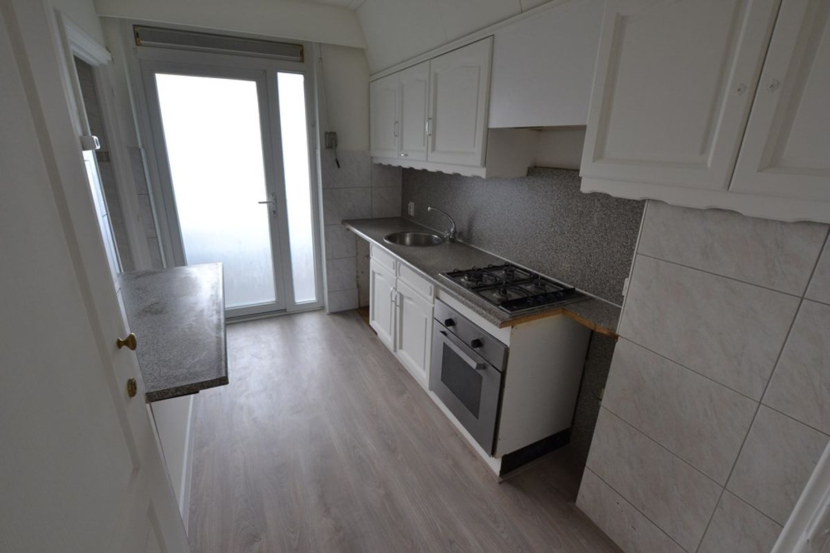 Keuken 3,15x2,10 met laminaatvloer, inbouwspots, deur naar balkon en meterkast, aanbouwkeuken met 4-pits gasfornuis met afzuigunit, bakoven, spoelbak en aansluiting was-apparatuur.