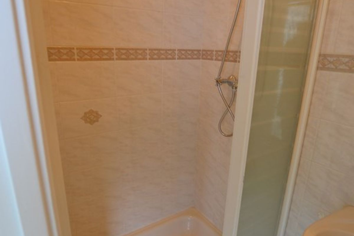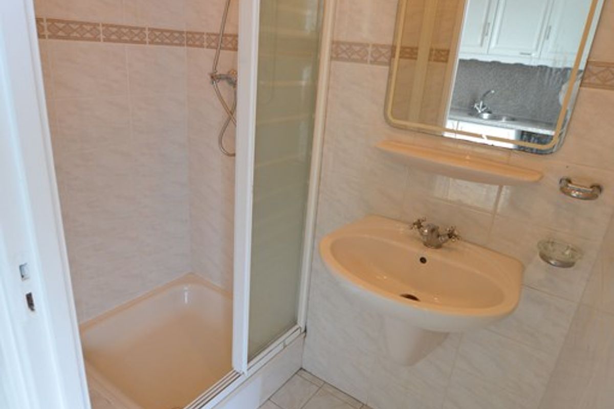 Geheel betegelde badkamer 1,75x1,05 met plavuizenvloer, inbouwspots, douche met cabine en wastafel.