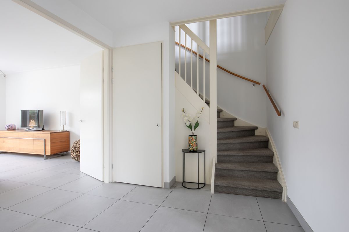 De hoofdentree ligt aan de zijkant van de woning. De ruime hal bevindt zich tussen de tuingerichte woonkamer en de sfeervolle woonkeuken. De dubbele openslaande deuren brengen u vanuit de hal naar de woonkamer, deze heeft een prachtige lichtinval dankzij de vele ramen. De openslaande deuren in de woonkamer brengen u naar de serre/tuinkamer waar u een fraai uitzicht heeft op de tuin en het sierwater. Hier is het ook in de koudere maanden van het jaar heerlijk vertoeven met vrienden en/of familie en lopen op de warme dagen van het jaar binnen en buiten moeiteloos in elkaar over. De serre is voorzien van een elektrisch bedienbaar zonnescherm.