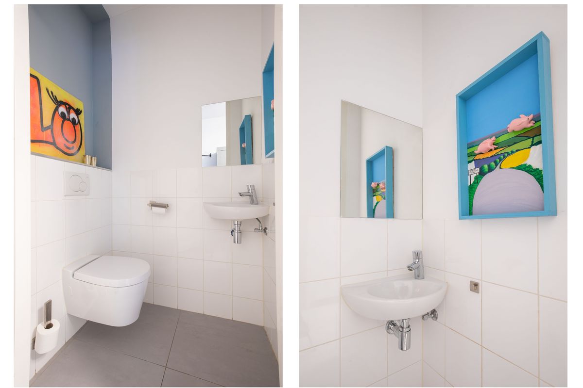 De badkamer is uitgerust met een ligbad, een inloopdouche, een breed wastafelmeubel met spiegelkast, uitgevoerd in hoogwaardige materialen en een toilet. De ruimte is geheel betegeld en heeft een natuurlijke lichtinval.