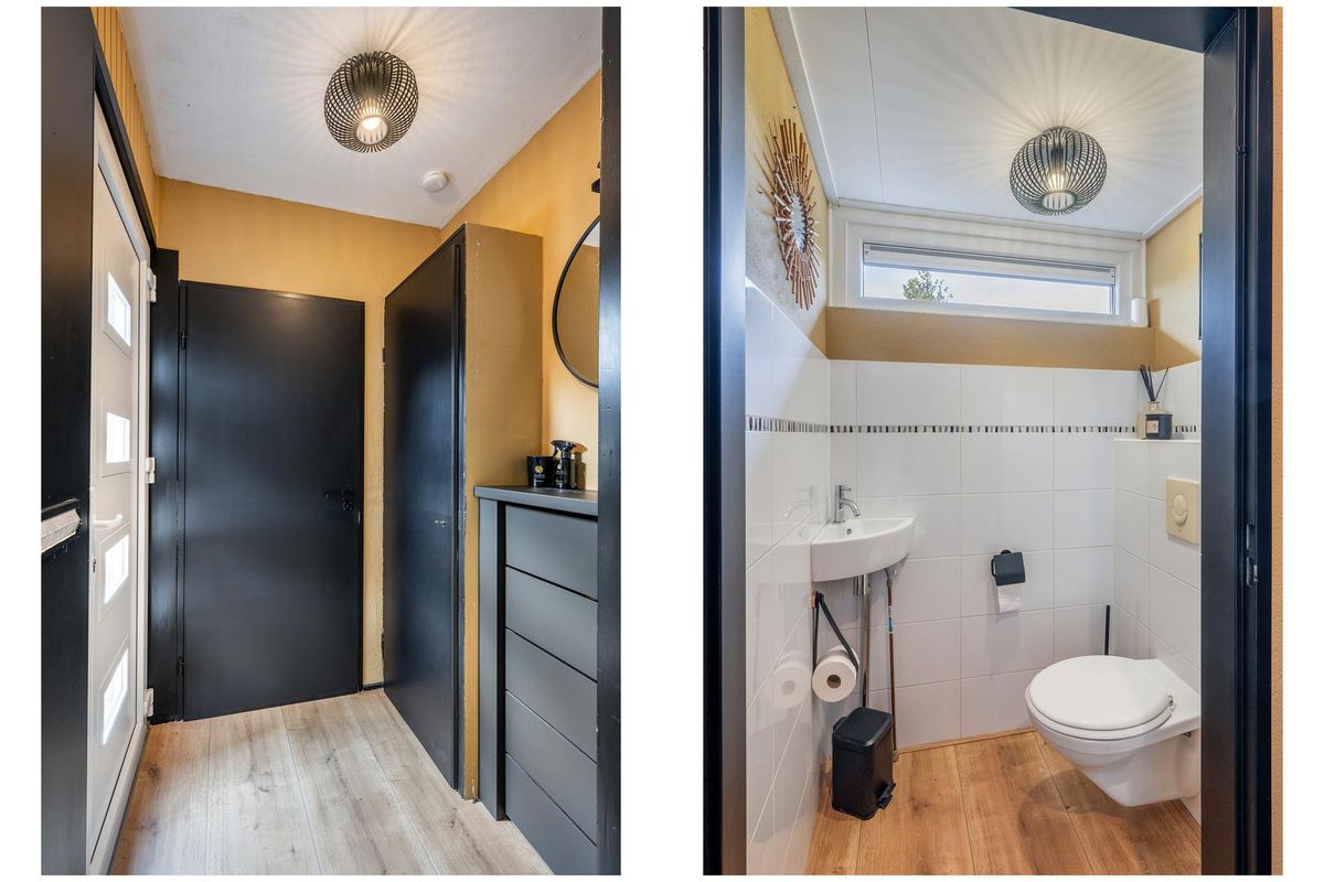 Hal/entree met kunststof voordeur (2018), de meterkast (9 groepen inclusief kookgroep, 2 aardlekschakelaars, omvormer zonnepanelen en slimme meters), deels betegeld hangtoilet met fonteintje en toegang tot de woonkamer.