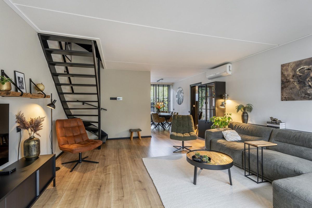 De ruime woonkamer is voorzien van een laminaatvloer die doorloopt in de hal, keuken en bijkeuken. In de woonkamer bevindt zich tevens de trap naar de eerste verdieping. Daarnaast is er een airco aanwezig die zowel kan verwarmen als koelen. Aan de voorzijde heb je een vrij uitzicht, terwijl je aan de achterzijde toegang hebt tot de bijkeuken en een doorloop naar de open keuken.