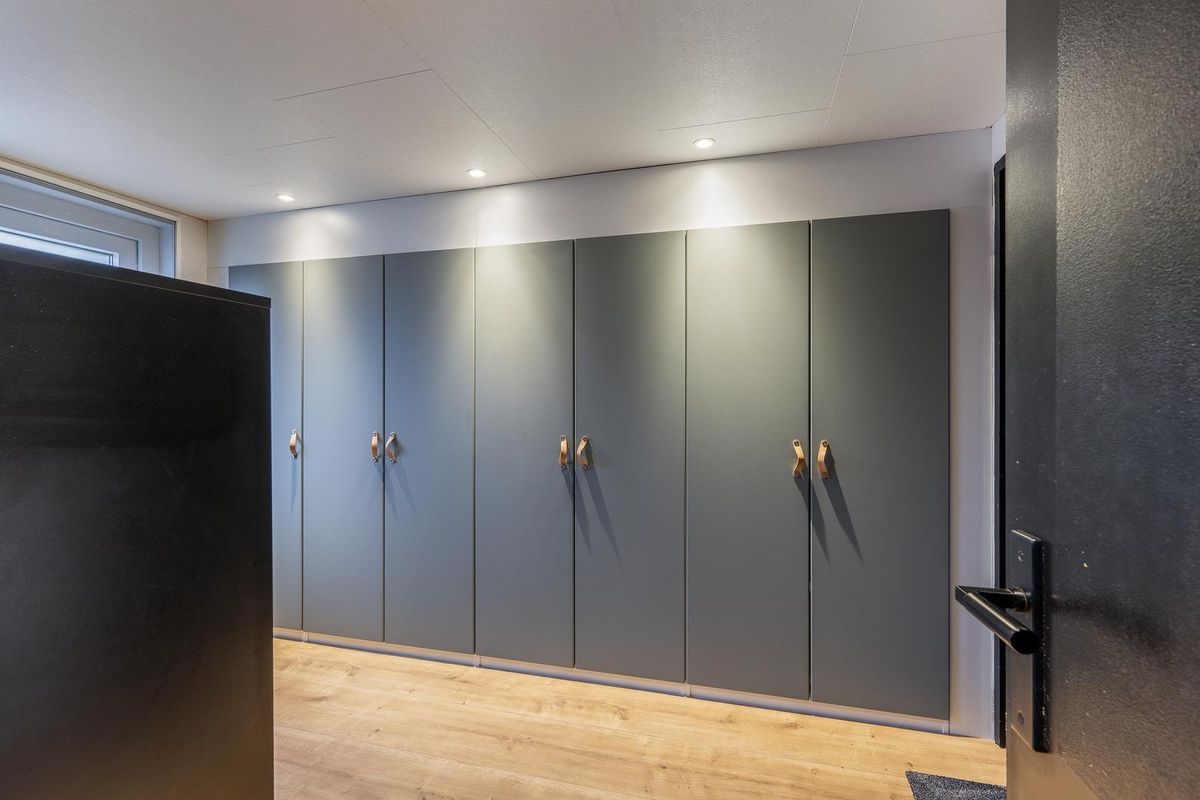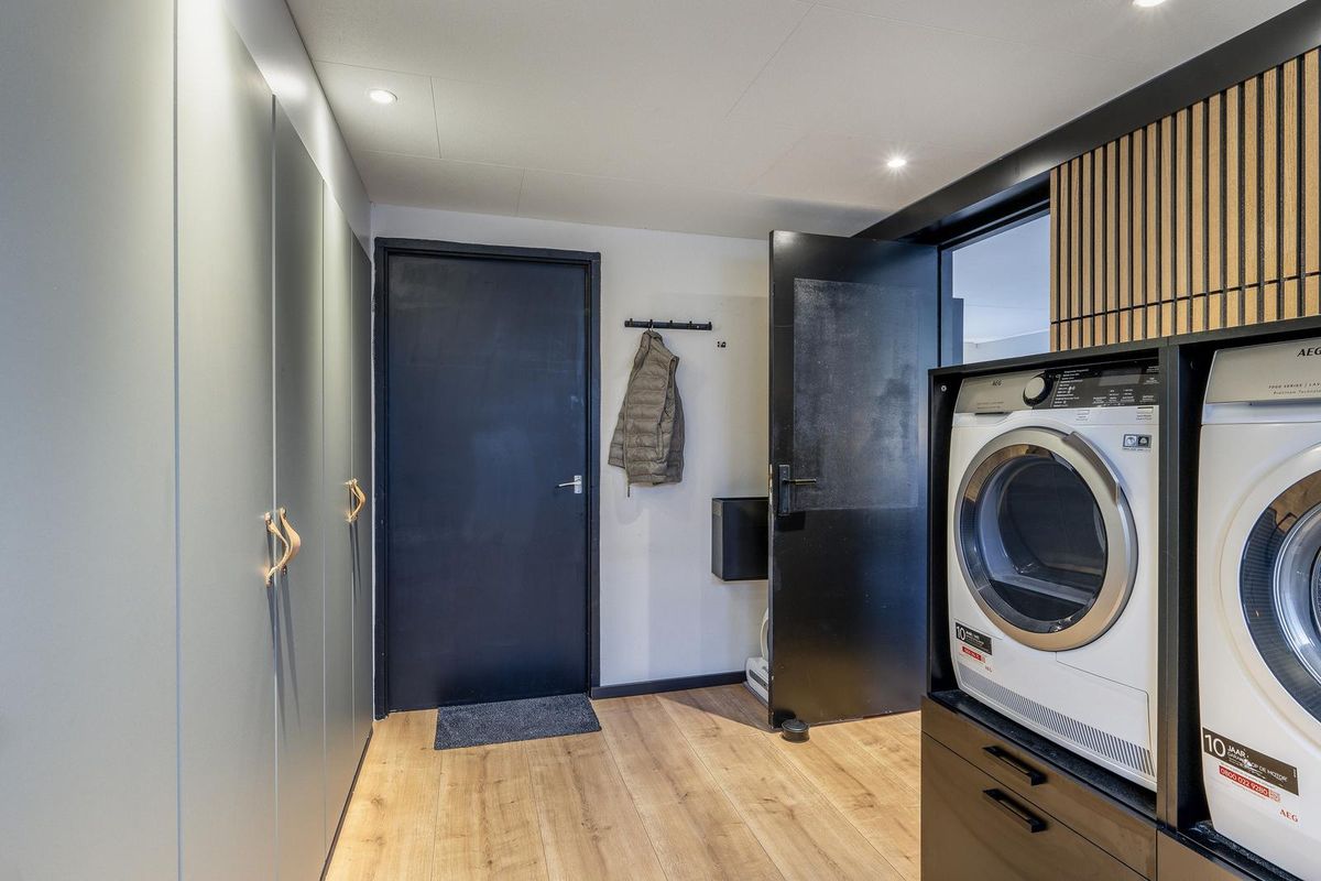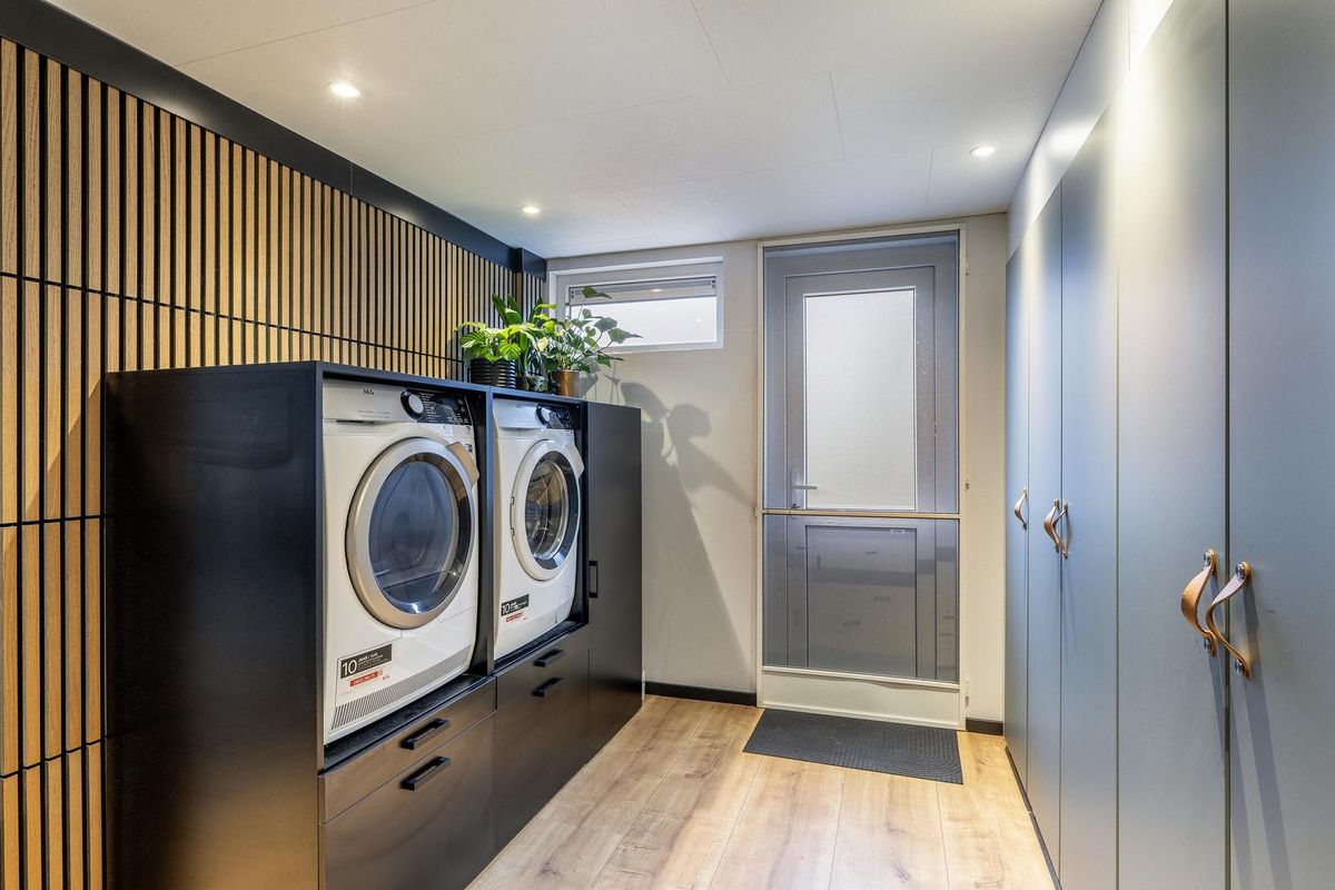 Hier bevinden zich de aansluitingen van wasmachine en droger, een vaste kastenwand, de achterdeur en een deur naar de garage.