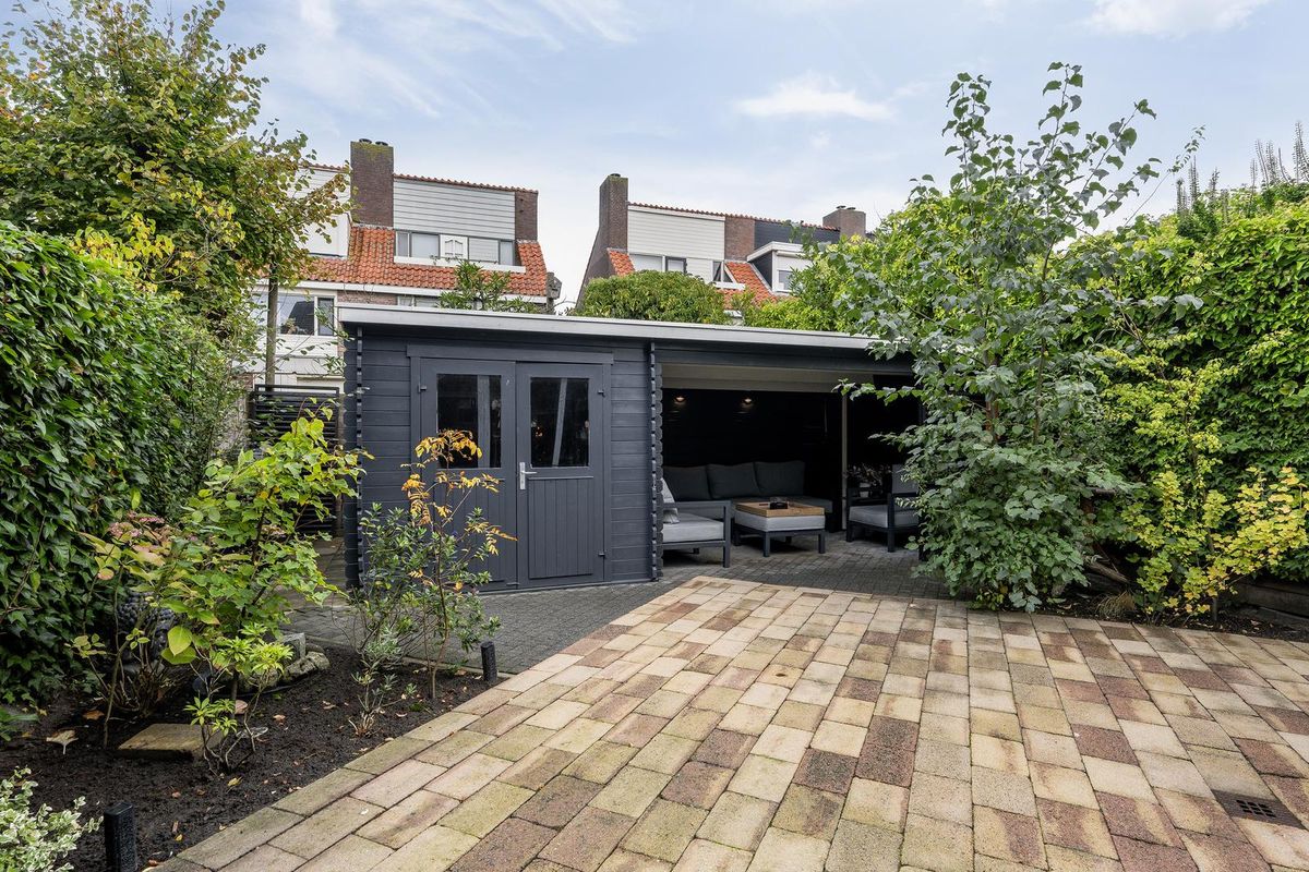 De onderhoudsvriendelijke achtertuin is gelegen op het noordwesten en heeft sierbestrating, plantenborders, een houten berging met overkapping voorzien van elektra.