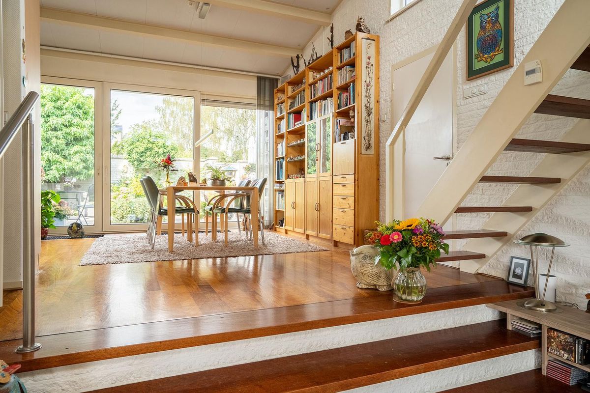 Begane grond: Via de carport kom je binnen via de berging of via de zijkant naar de woning. Vanuit de open hal, kom je in de leefruimte, welke visueel wordt vergroot door de vide/ entresol en door de split-level, iets lager gelegen zitkuil/ woonkamer. De open keuken heeft een grote brede schuifpui, waardoor er veel licht en zicht op de achtergelegen tuin is. Vanuit de woonkamer ga je via een kleine hal naar een tuingerichte slaapkamer en een straatgerichte kamer, vanuit beide kamers is de gedateerde badkamer binnendoor te bereiken.