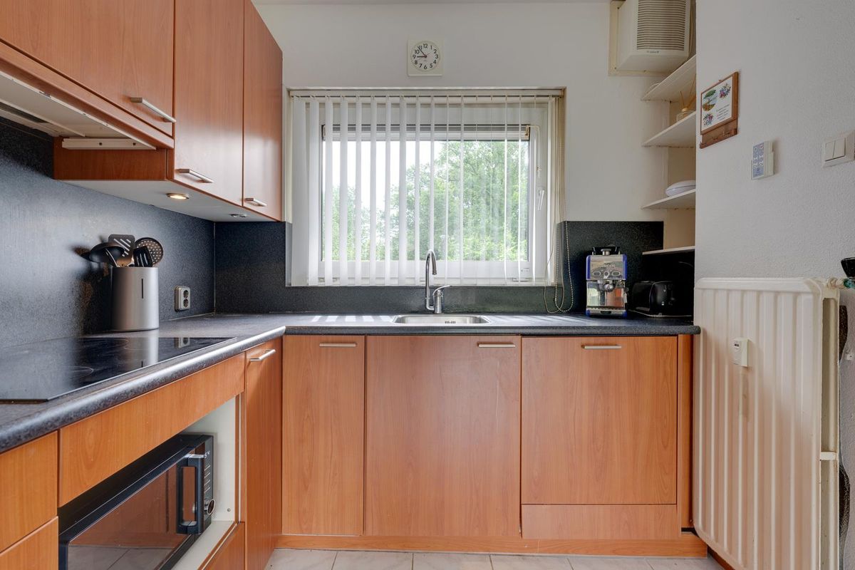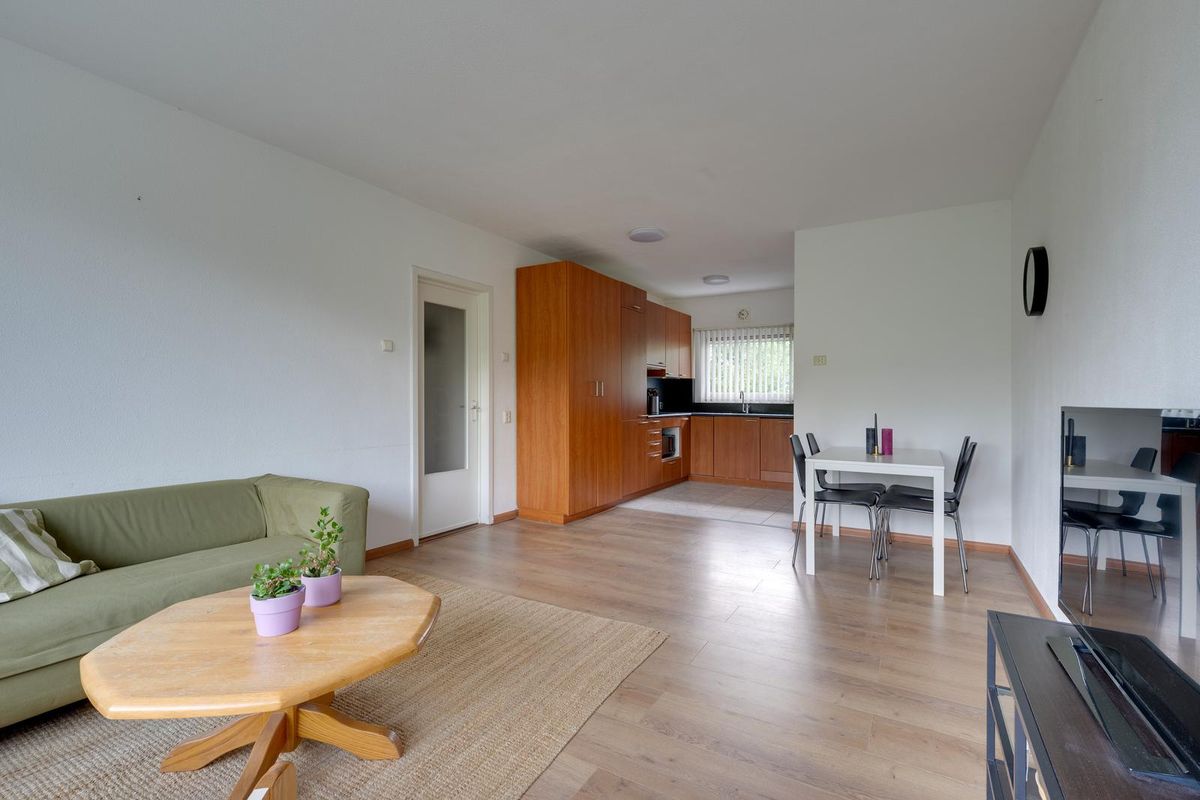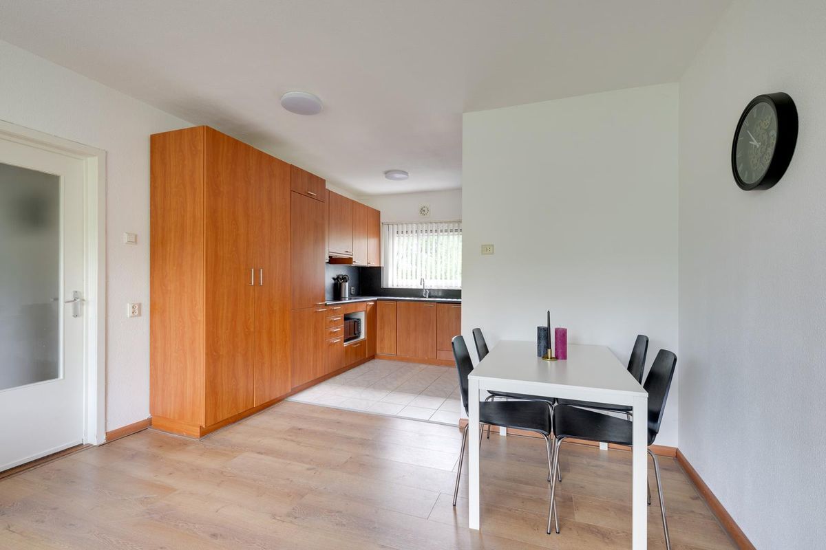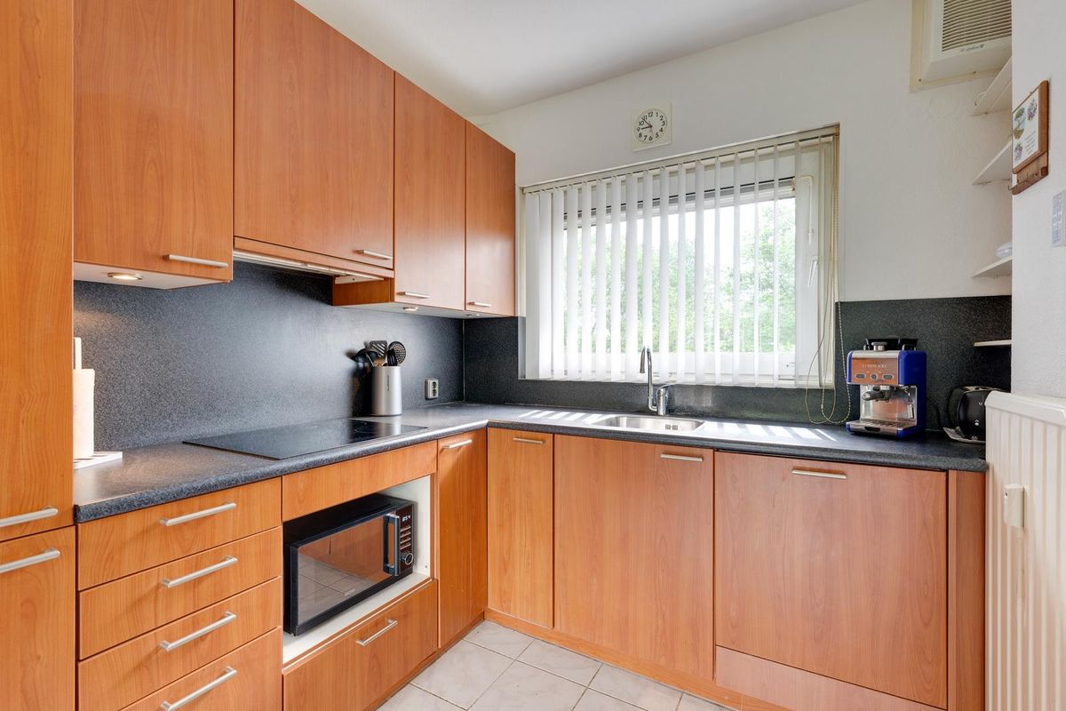 Via de hal kom je binnen in de lichte woonkamer aan de voorzijde van de woning. Aansluitend bevindt zich de open keuken, die is voorzien van diverse inbouwapparatuur.