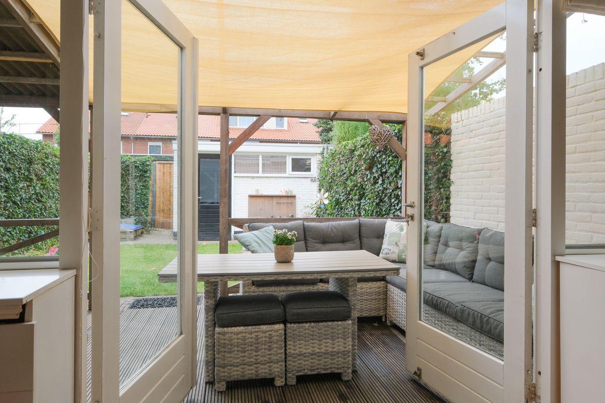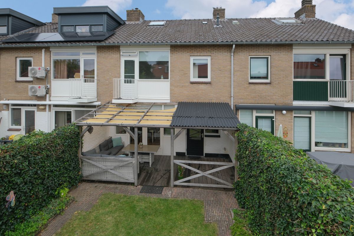 De tuin, bereikbaar via de openslaande terrasdeuren en/of de achterdeur, ligt op het zuiden en is een heerlijke plek om te ontspannen. Met een groot terras, een fijn stukje gazon en een overkapping kun je hier in alle seizoenen genieten. Een stenen berging met elektra en een achterom maken het plaatje compleet.