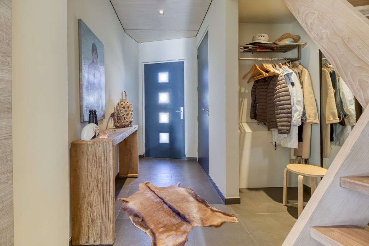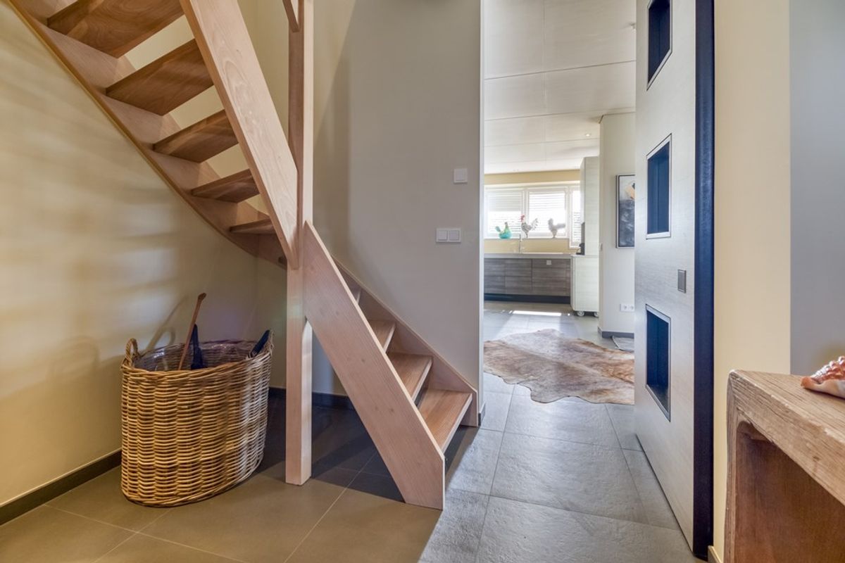 Bij binnenkomst treft u de hal met garderoberuimte, een toilet met fonteintje en de trap naar de eerste verdieping.