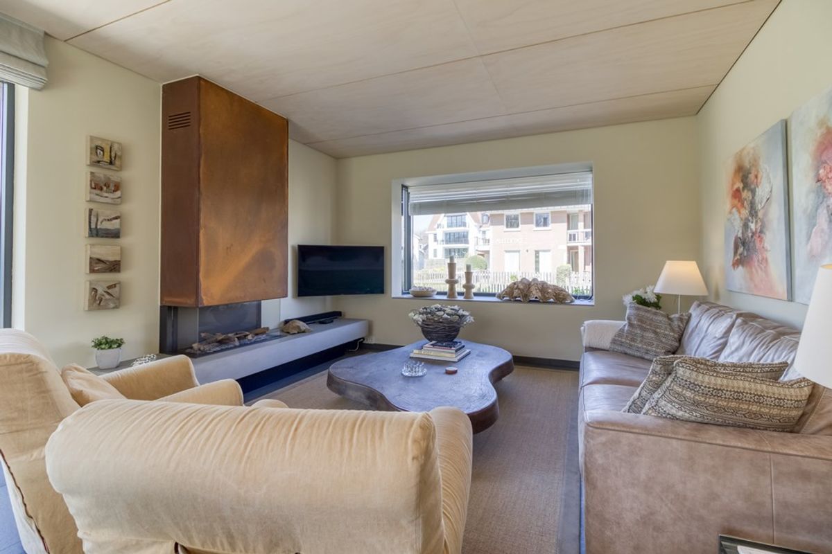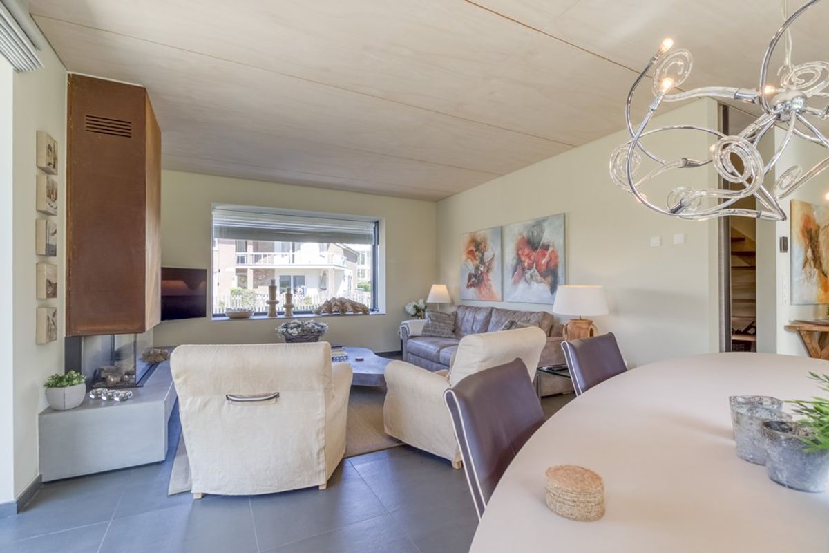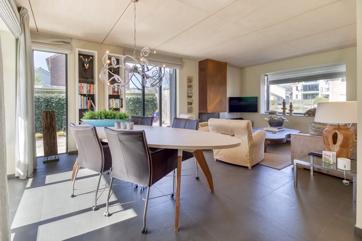 De lichte woonkamer met zit- en eethoek beschikt over grote raampartijen en biedt een fraai uitzicht op de tuin. Een sfeervolle gashaard zorgt voor extra gezelligheid tijdens de wintermaanden.