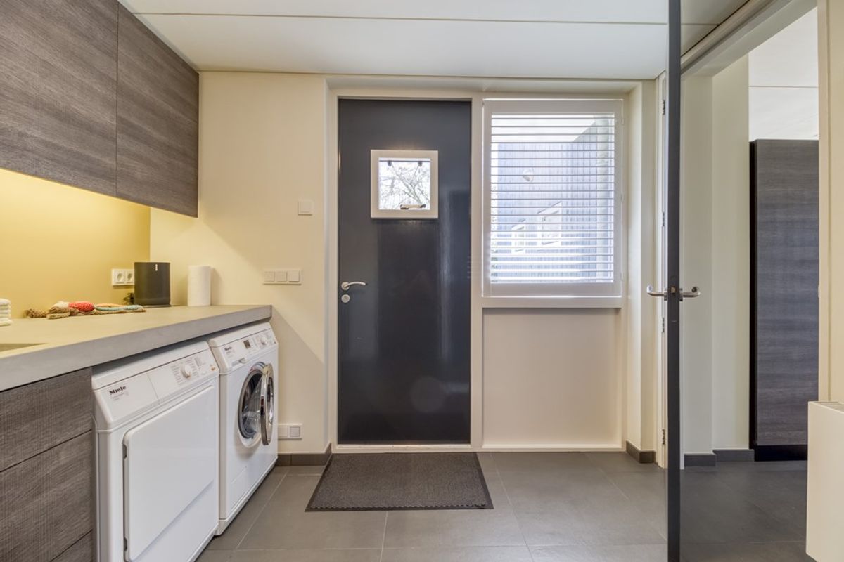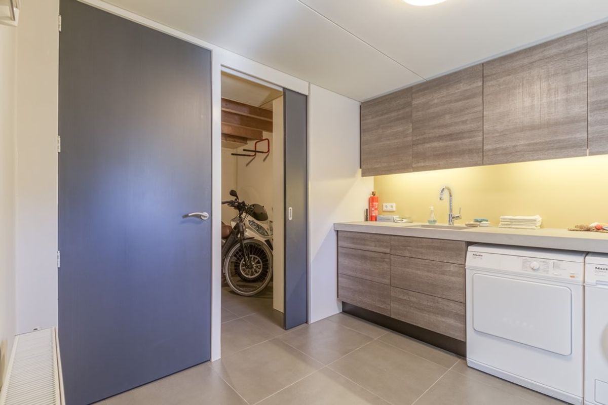 Aansluitend bevindt zich de bijkeuken met spoelbak, wasmachine en droger. Vanuit hier bereikt u zowel de tuin als de berging/garage met dubbele deuren aan de voorzijde van de woning.
