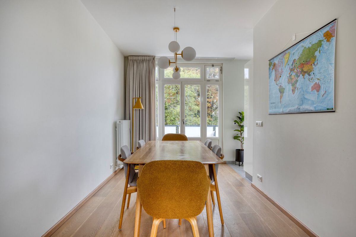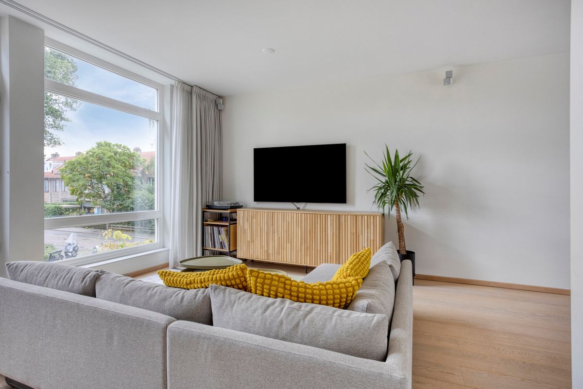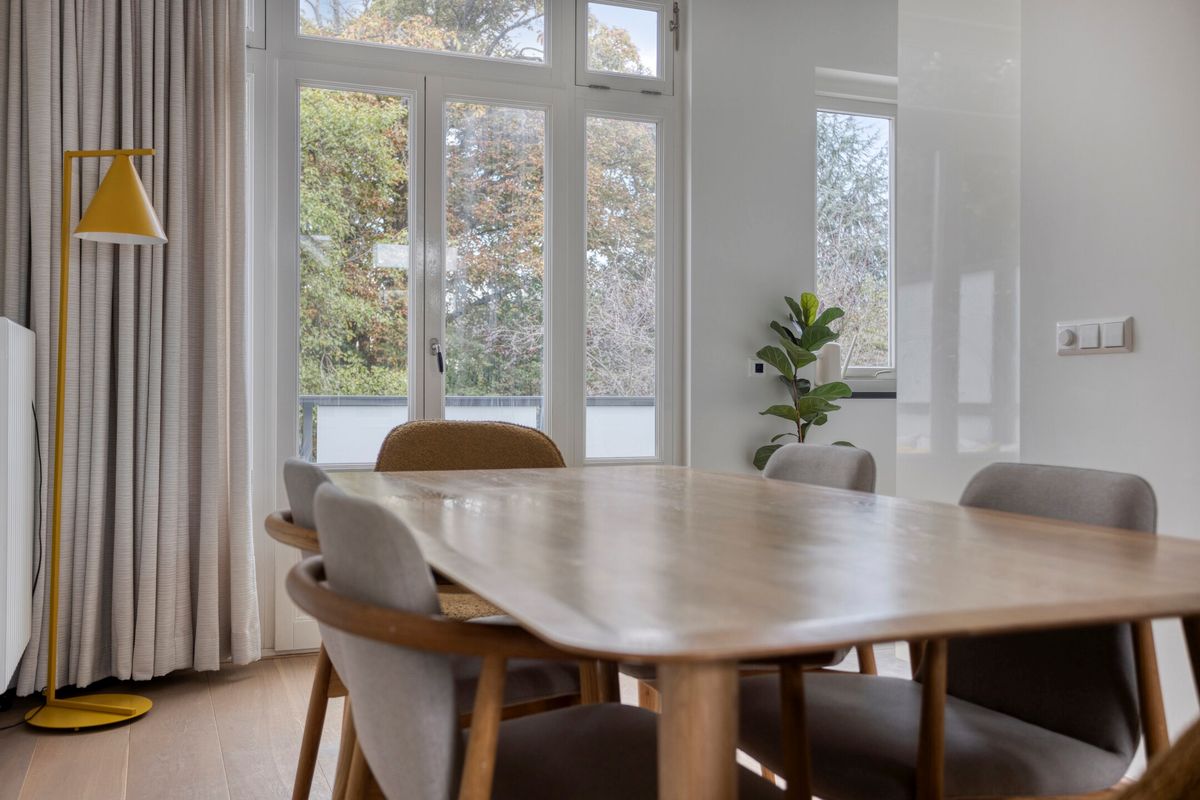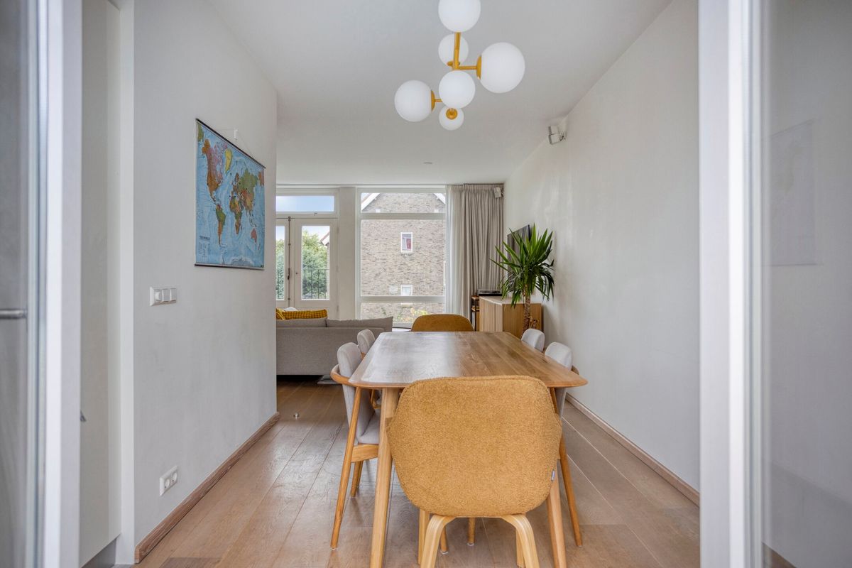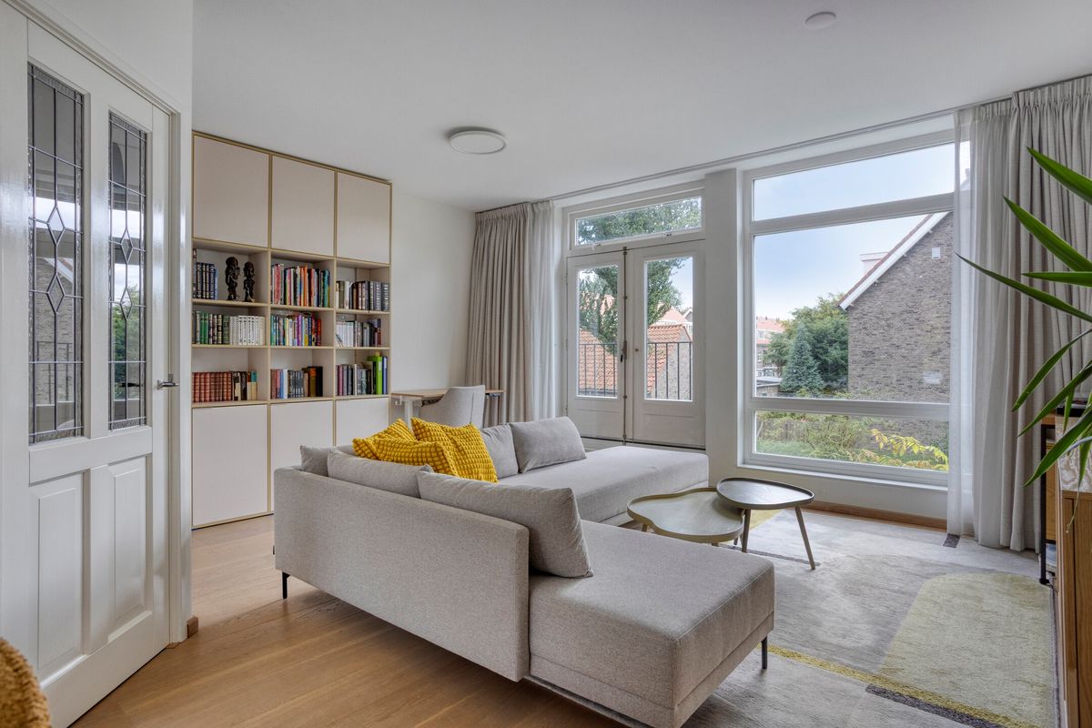 The hallway, via a beautiful panel door with stained glass, leads to the spacious L-shaped living/dining room with open kitchen. At the front is the sitting area with unobstructed views over Mr. Troelstralaan and a charming French balcony with double doors. At the rear, the dining area also features double French doors opening onto the generous roof terrace of approx. 15 m².