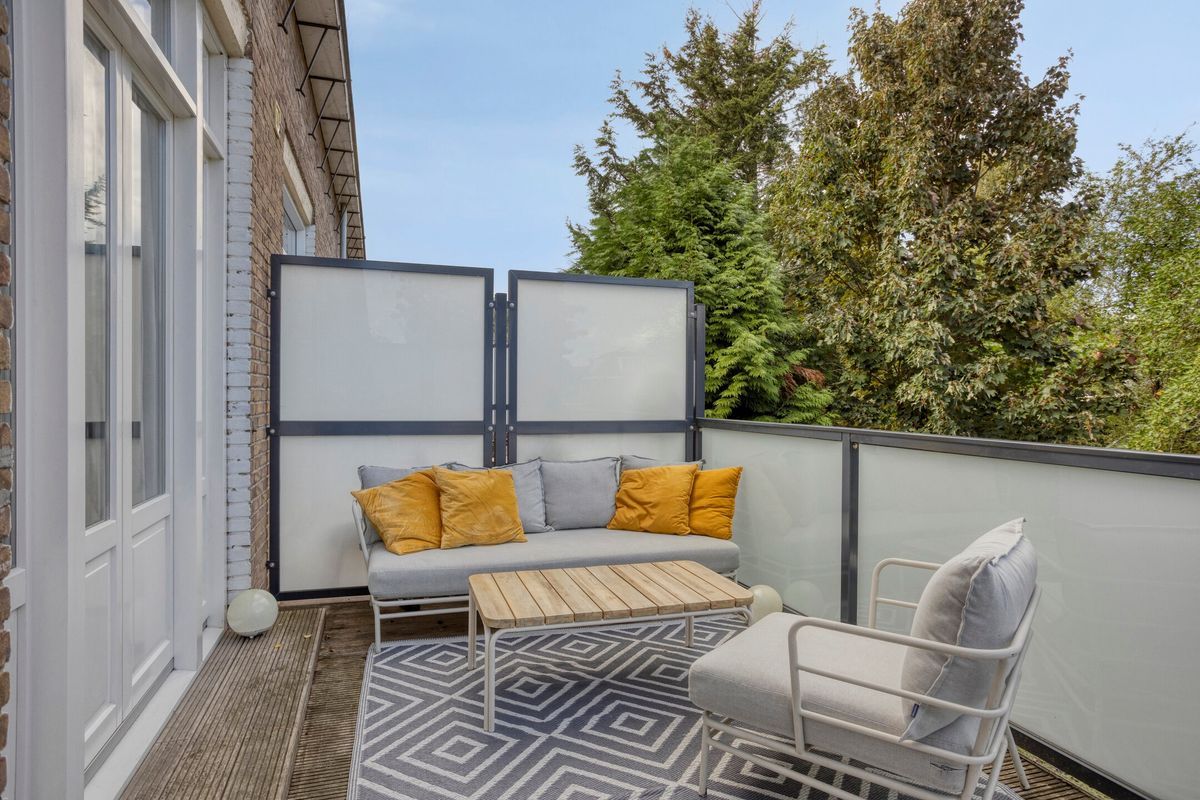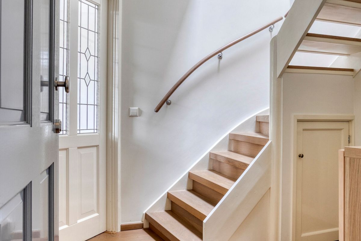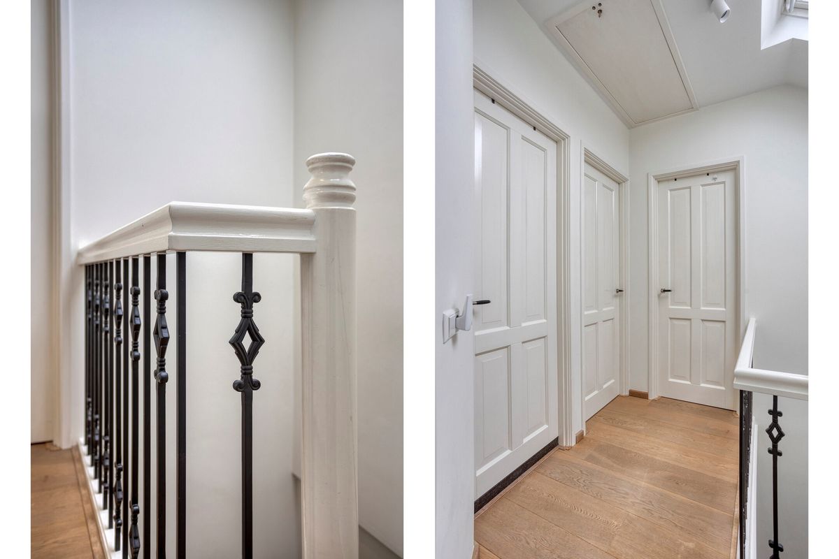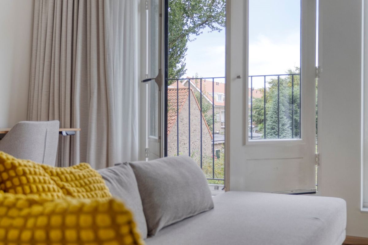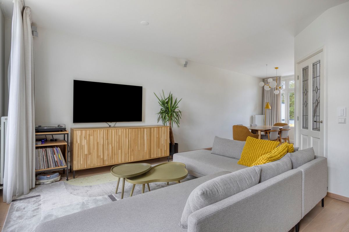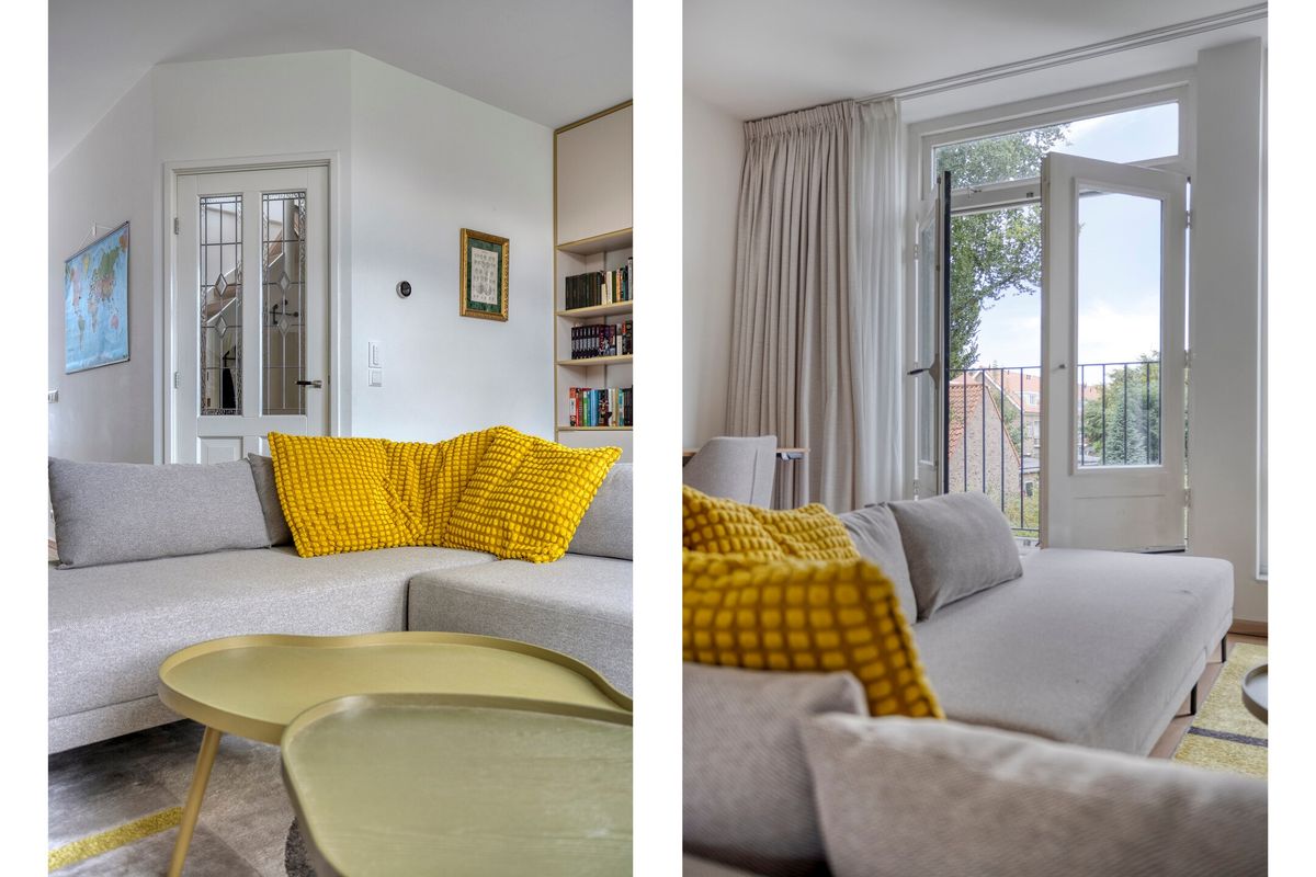 The hallway, via a beautiful panel door with stained glass, leads to the spacious L-shaped living/dining room with open kitchen. At the front is the sitting area with unobstructed views over Mr. Troelstralaan and a charming French balcony with double doors. At the rear, the dining area also features double French doors opening onto the generous roof terrace of approx. 15 m².