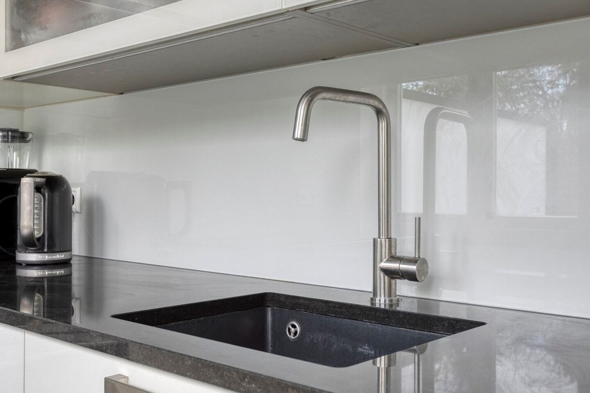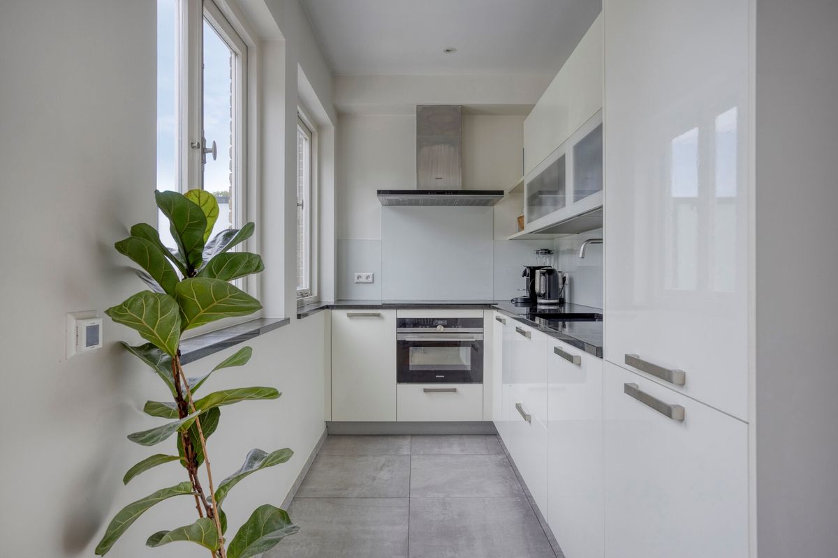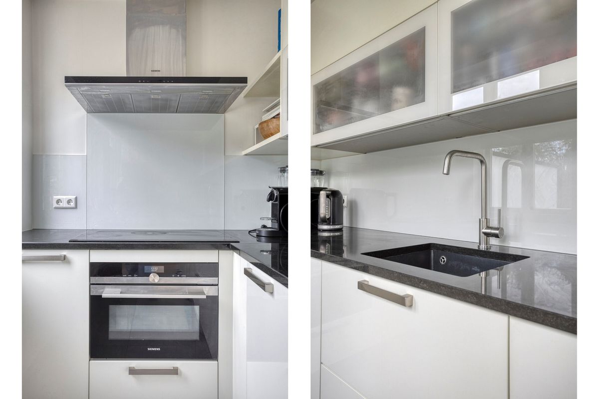 De open nette keuken is uitgevoerd met een natuurstenen aanrechtblad, een Villeroy & Boch spoelbak en een Hans Grohe mengkraan en voorzien van Siemens inbouwapparatuur, waaronder een extra brede inductiekookplaat (met wokfunctie), vaatwasser, ruime koel-/vriescombinatie, combi-oven/magnetron, ultrastille afzuigkap en diverse opbergkasten.
