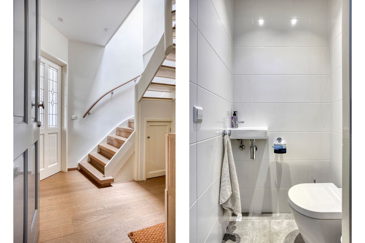 Via de eikenhouten trap bereikt u de tweede verdieping, waar de overloop dankzij een groot Velux dakraam heerlijk licht is. Hier vindt u een tweede, eveneens modern betegeld toilet met hangend closet en fontein.