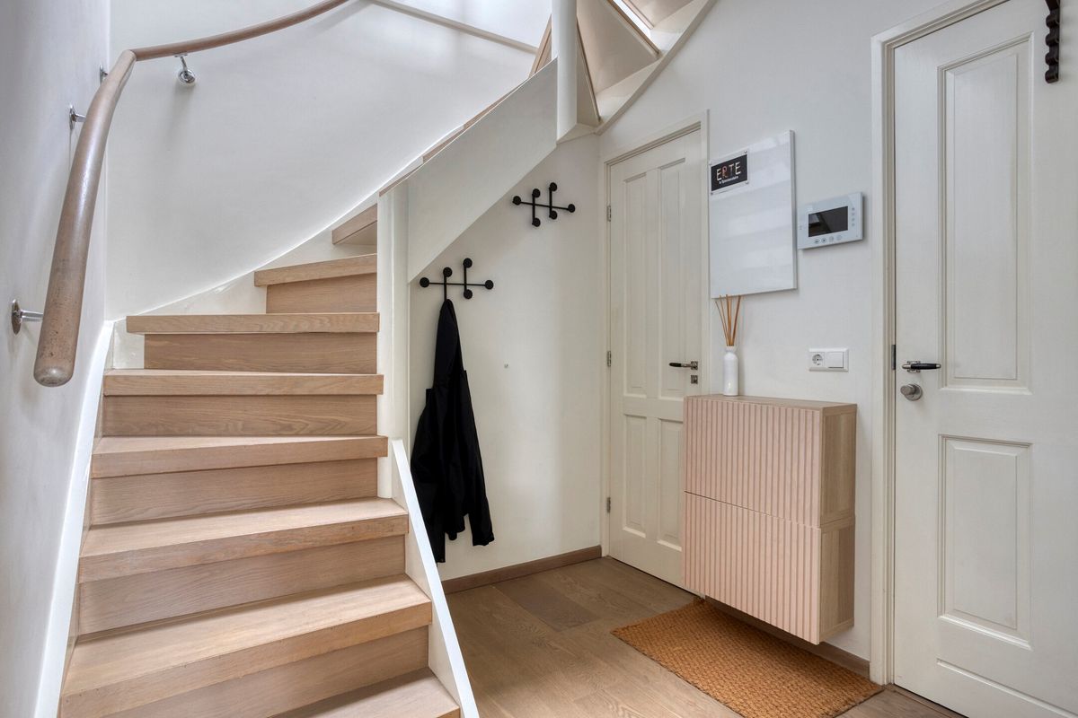 Via het gedeelde portiek en de trap met plavuizen bereikt u de entree van het appartement op de eerste verdieping. In de hal bevinden zich het modern betegelde toilet met hangend closet en fontein, een vaste trappenkast en de trapopgang naar de tweede verdieping. Ook is hier de bediening van de centrale voordeur via video-intercom aanwezig.