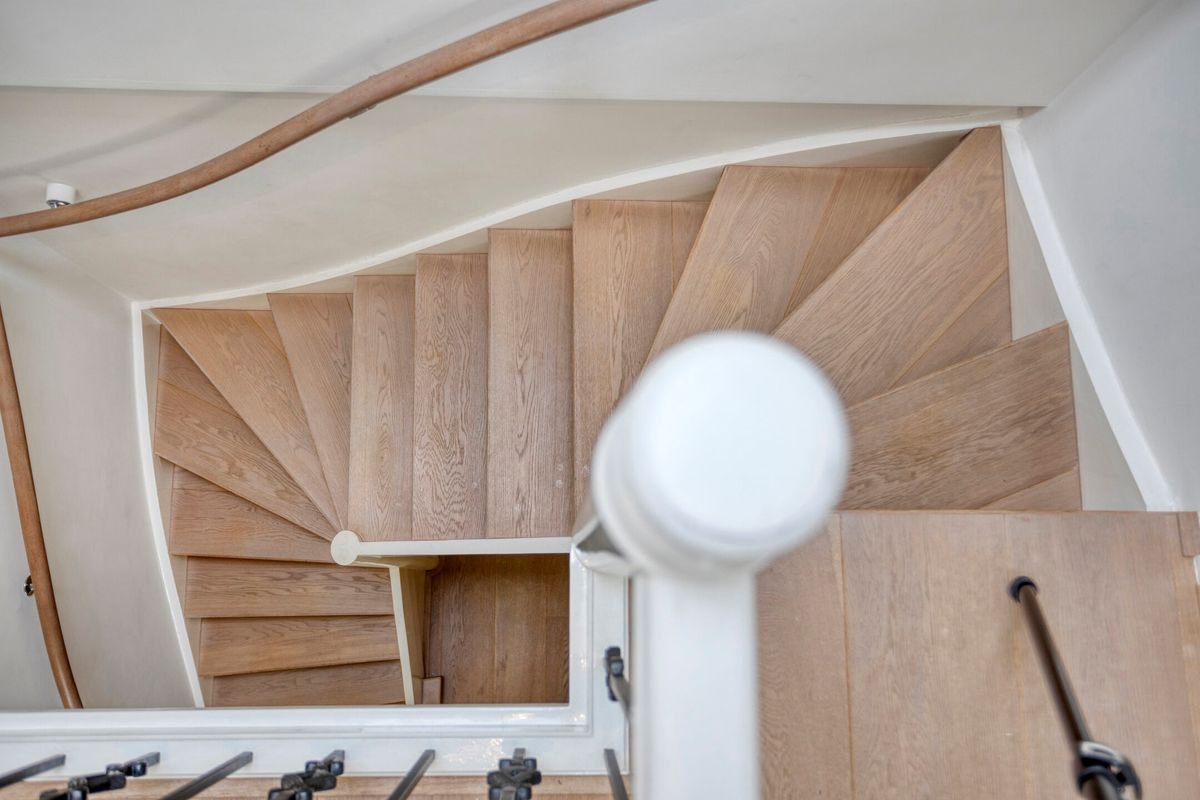Through the shared entrance and tiled staircase you reach the entrance to the apartment on the first floor. In the hallway you’ll find the modern tiled toilet with wall-hung closet and washbasin, a built-in staircase cupboard, and the stairs to the second floor. The video intercom system for the main entrance is also located here.
