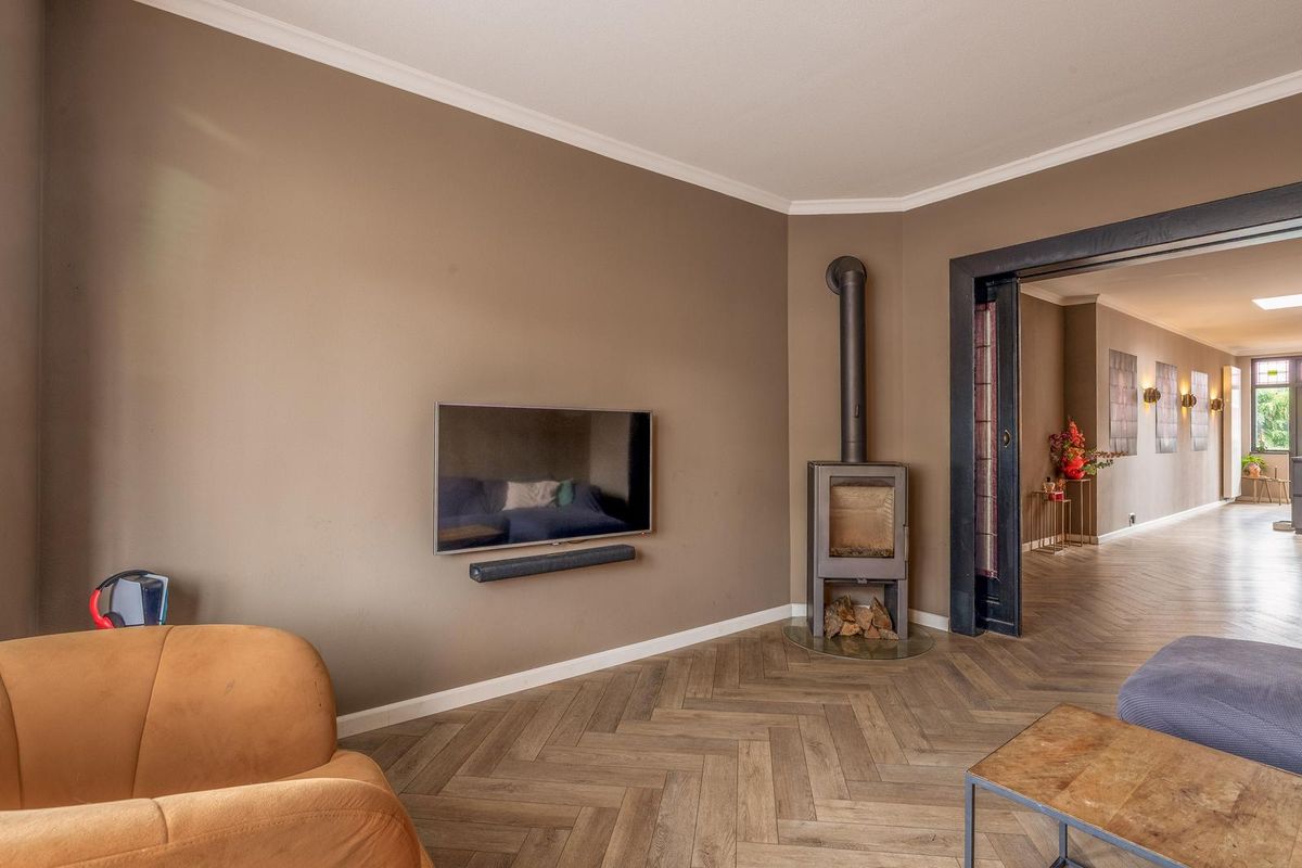 De woonkamer is in 2020 royaal uitgebouwd en voorzien van een pvc-vloer in visgraatmotief met hoge plinten. De originele voorkamer aan de straatzijde kan met elegante Portes Françaises met glas-in-lood worden afgesloten — perfect als werk- of zitkamer. Er is een houtkachel aanwezig. De open leefruimte in het midden biedt veel indelingsvrijheid en een ruimtelijk gevoel.