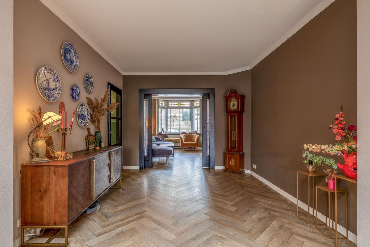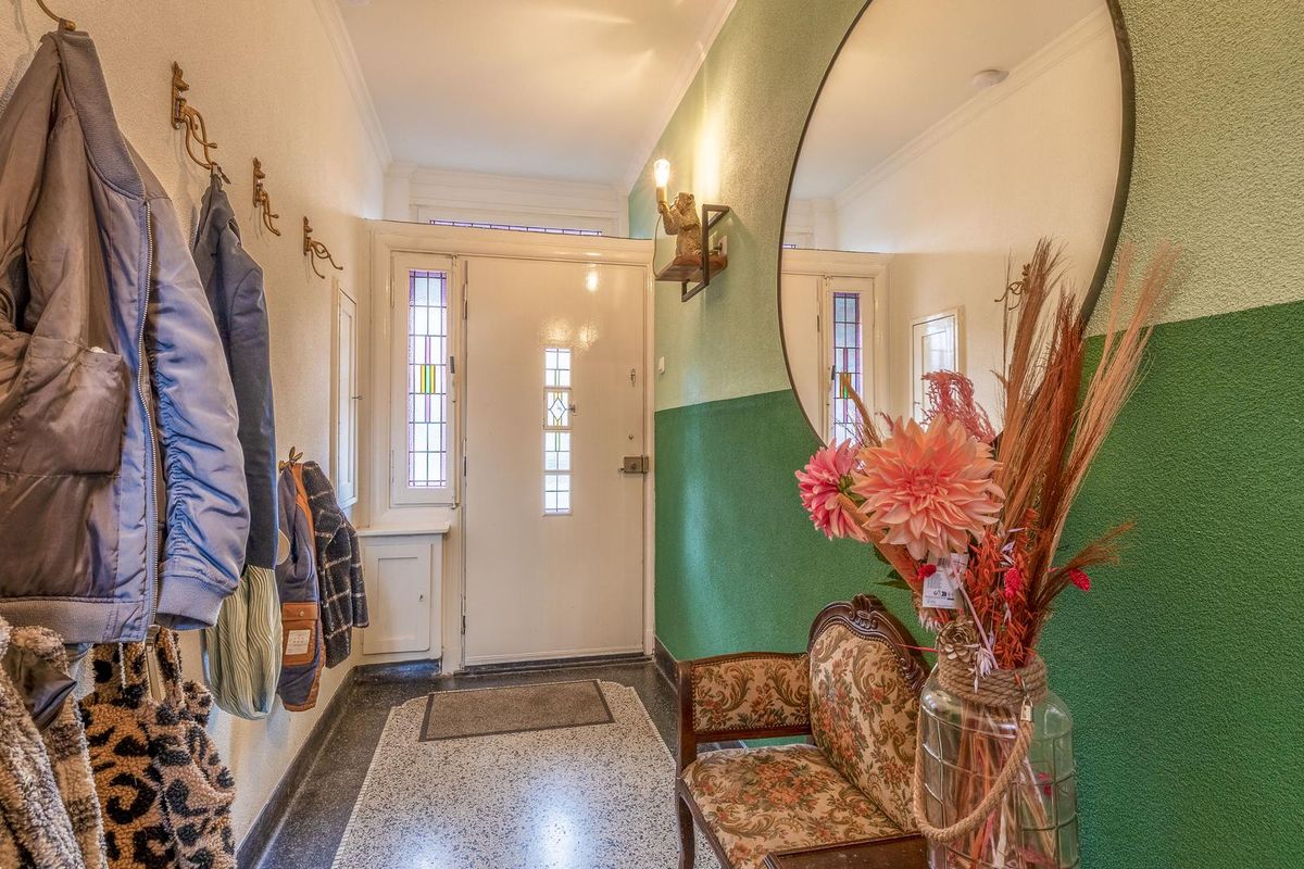 Al bij aankomst verraadt de karakteristieke gevel met erker, glas-in-loodramen en overdekte entree dat dit geen doorsnee woning is. Binnenkomend in de hal valt direct de prachtig gerestaureerde originele terrazzovloer op. De stijlvolle trapopgang en authentieke paneeldeuren versterken het jaren ’30 karakter. In de hal bevindt zich tevens het deels betegelde toilet met wandcloset en een fraai in stijl uitgevoerd fonteintje. Vanuit de hal zijn zowel de kelder als de woonkamer bereikbaar.