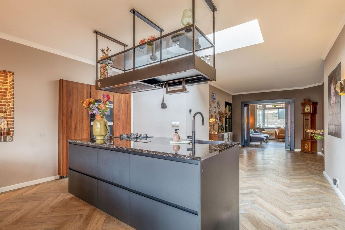 Aan de achterzijde bevindt zich de moderne leefkeuken, compleet met kookeiland, koffiehoek en een prachtige lichtstraat die zorgt voor een overvloed aan daglicht. De glazen pui met openslaande deuren verbindt binnen en buiten op natuurlijke wijze.