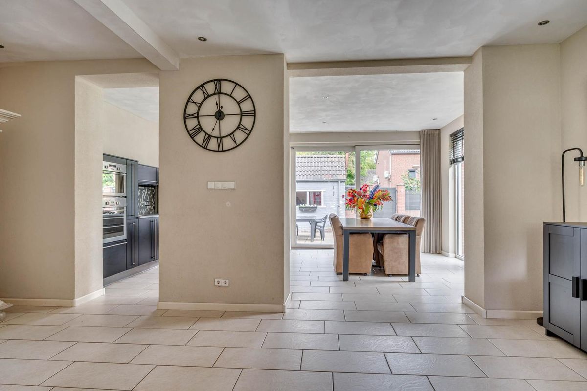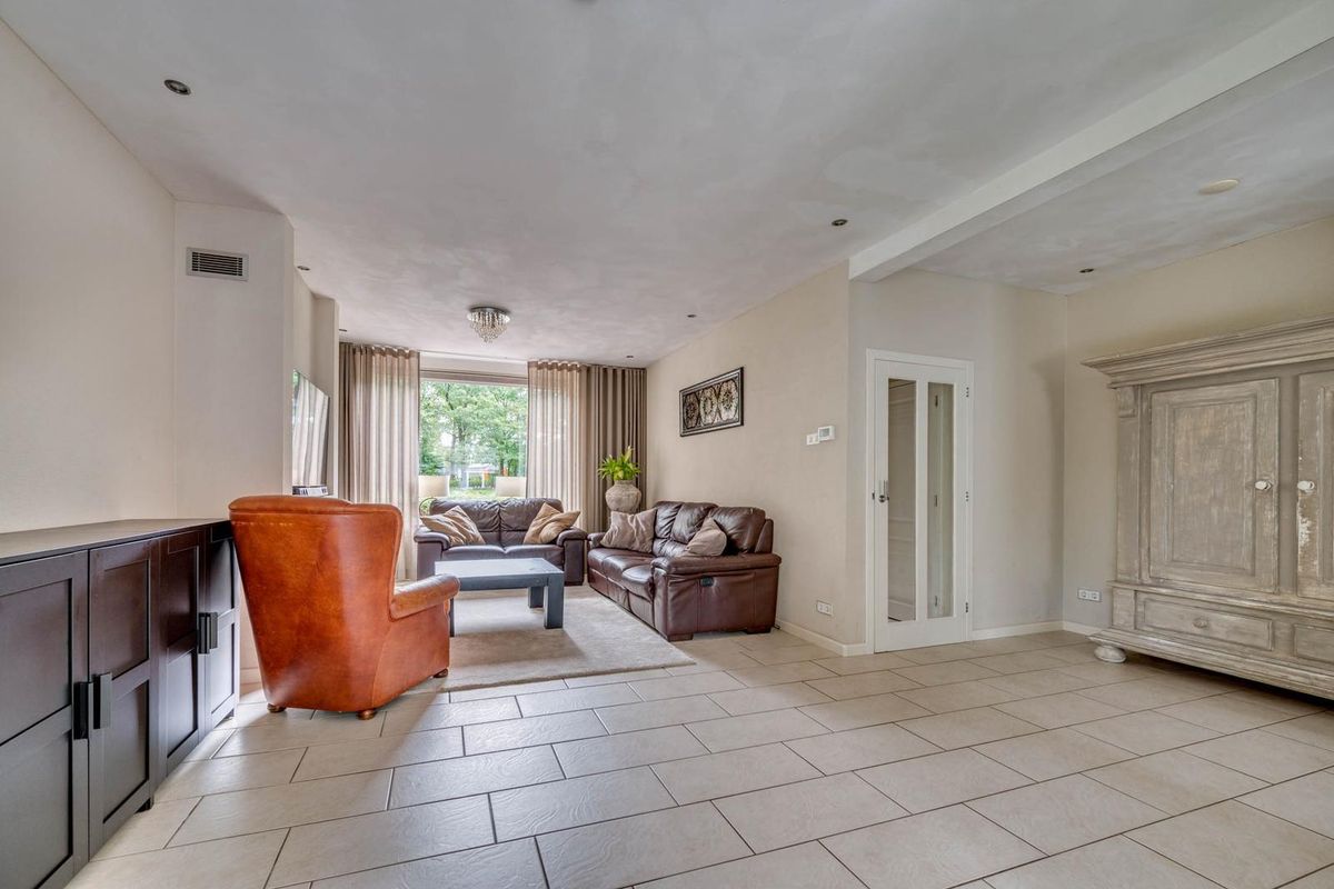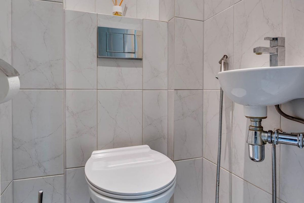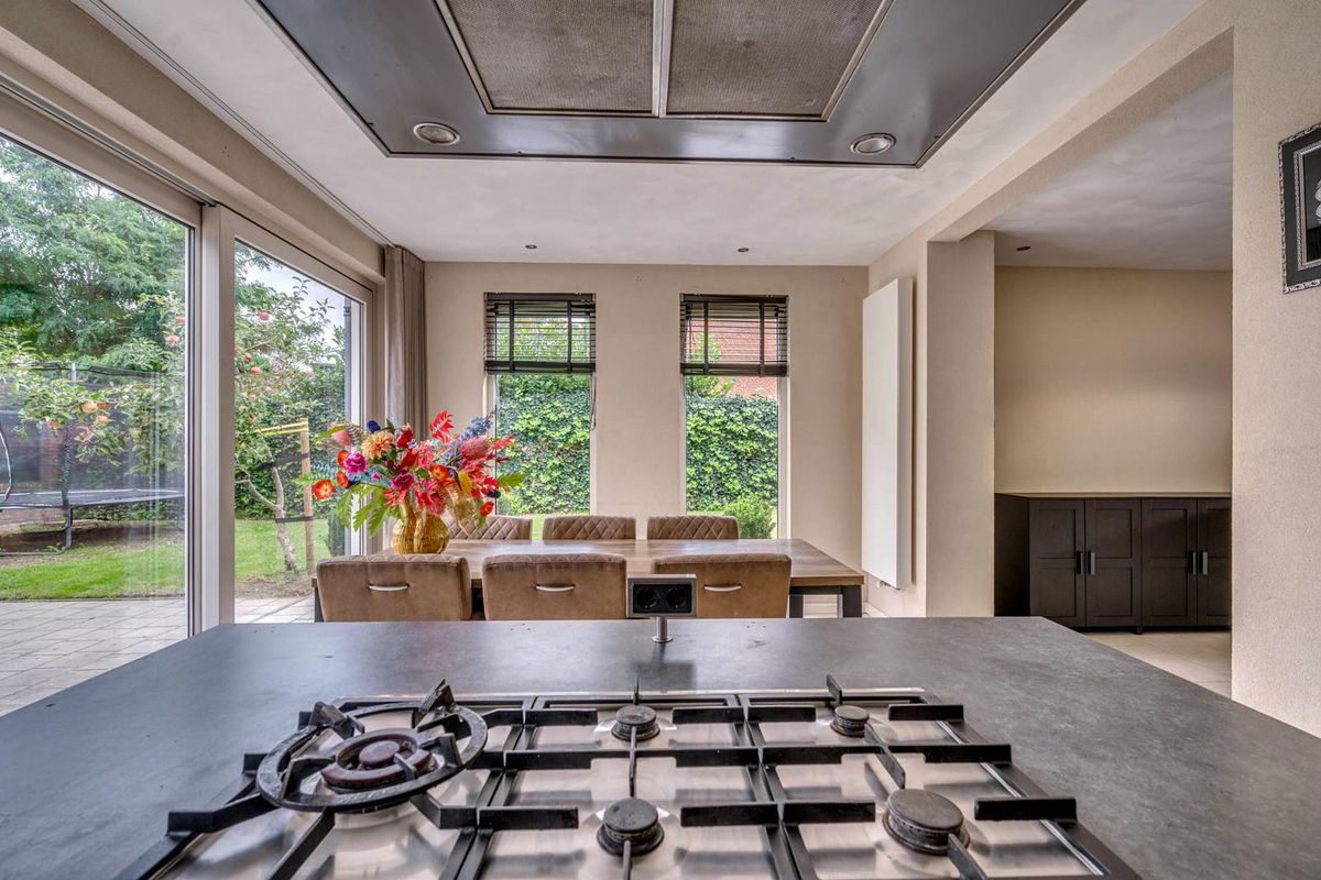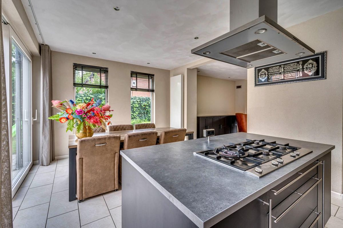 De geheel betegelde toiletruimte is voorzien van een zwevend toilet en fontein. Middels een loopdeur is de woonkamer te bereiken. De woonkamer geeft toegang tot het zitgedeelte en de eetkamer aan de achterzijde met open keuken en schuifpui naar de tuin. De grote raampartijen aan de voor en achterzijde van de woonkamer geeft veel natuurlijk lichtinval. De keuken welke in open verbinding staat met de woonkamer is o.a. voorzien van een kookeiland. De keuken beschikt over een 4-pits gasfornuis, afzuigkap, wokbrander, oven, magnetron, koelkast, diepvries en zeer veel opbergruimte. De woonkamer en zitkamer zijn geheel voorzien van inbouwspots. Verder is de gehele begane grond voorzien van een lichte tegelvloer met vloerverwarming.